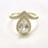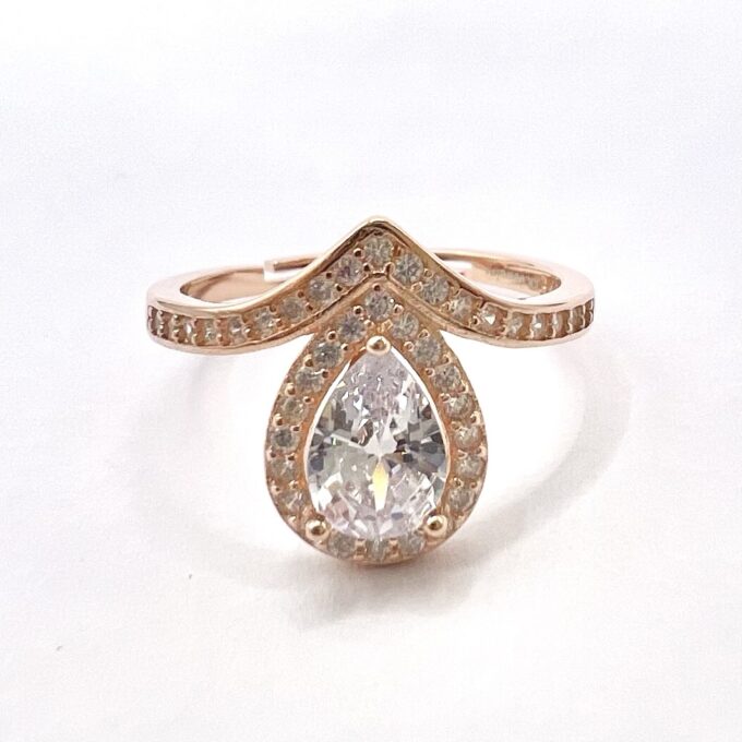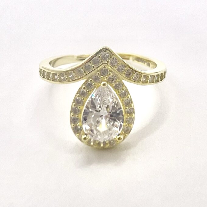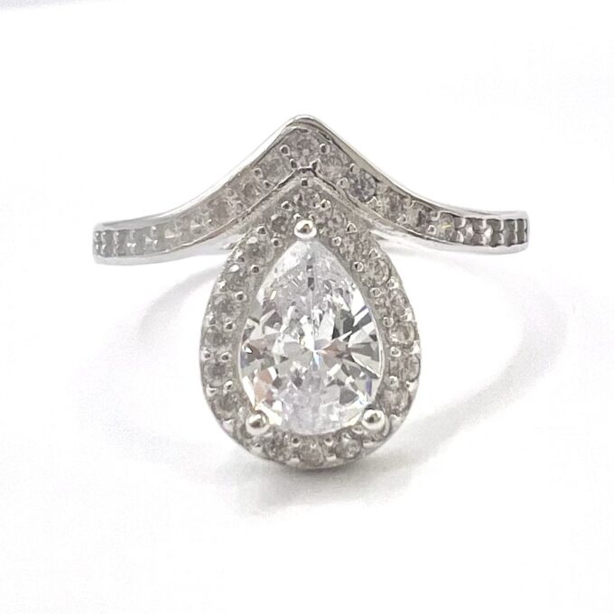 טבעת בצורת וי משובצת אבני זרקון עם אבן זרקון בצורת טיפה משובצת מסביב מכסף אמיתי 925