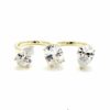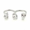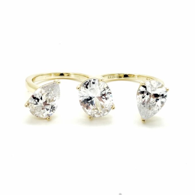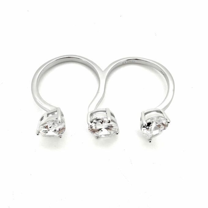 טבעת מחוברת לטבעת שמתלבשת על שתי אצבעות מקבילות משובצת אבני זרקון בשלושה צורות שונות