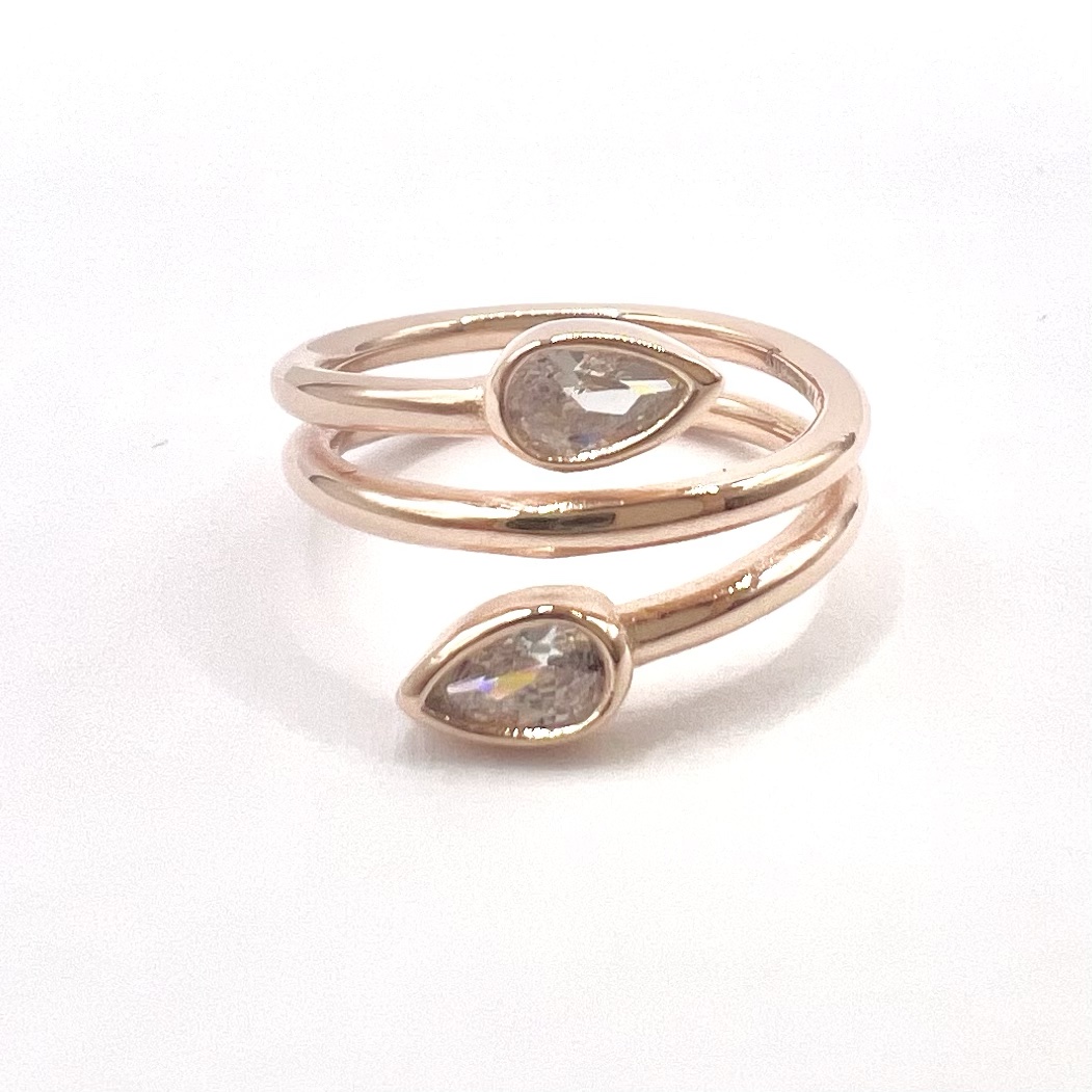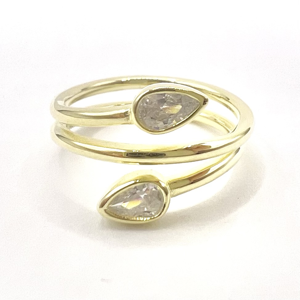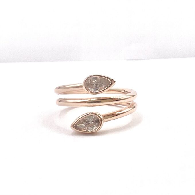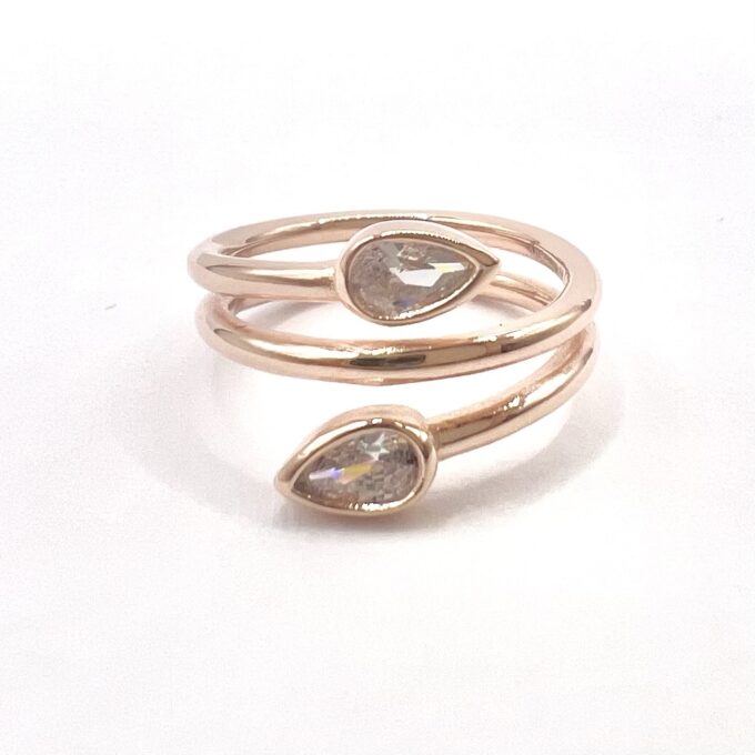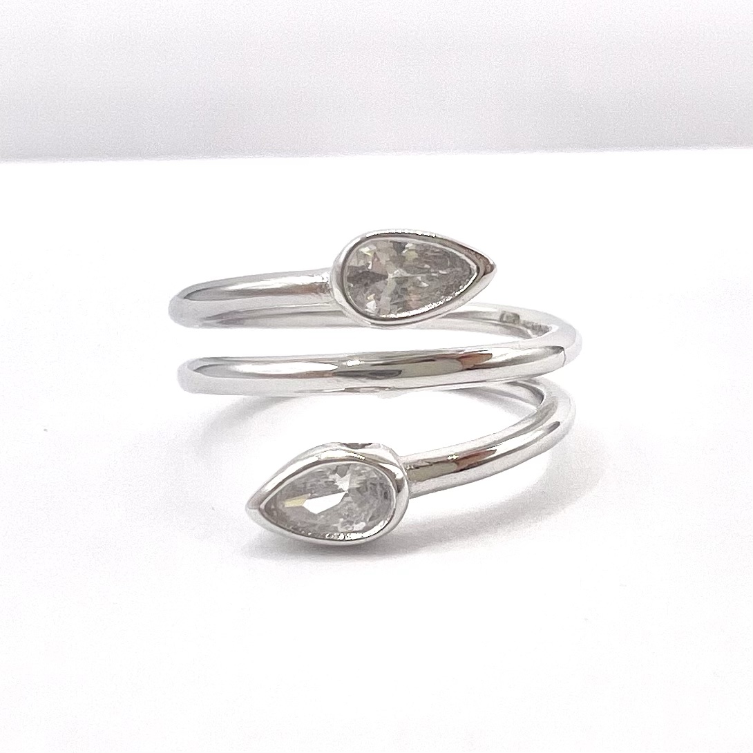 טבעת חלקה מסולוסלת עם שתי אבני זרקון בצורת טיפה משתי הצדדים מכסף אמיתי 925