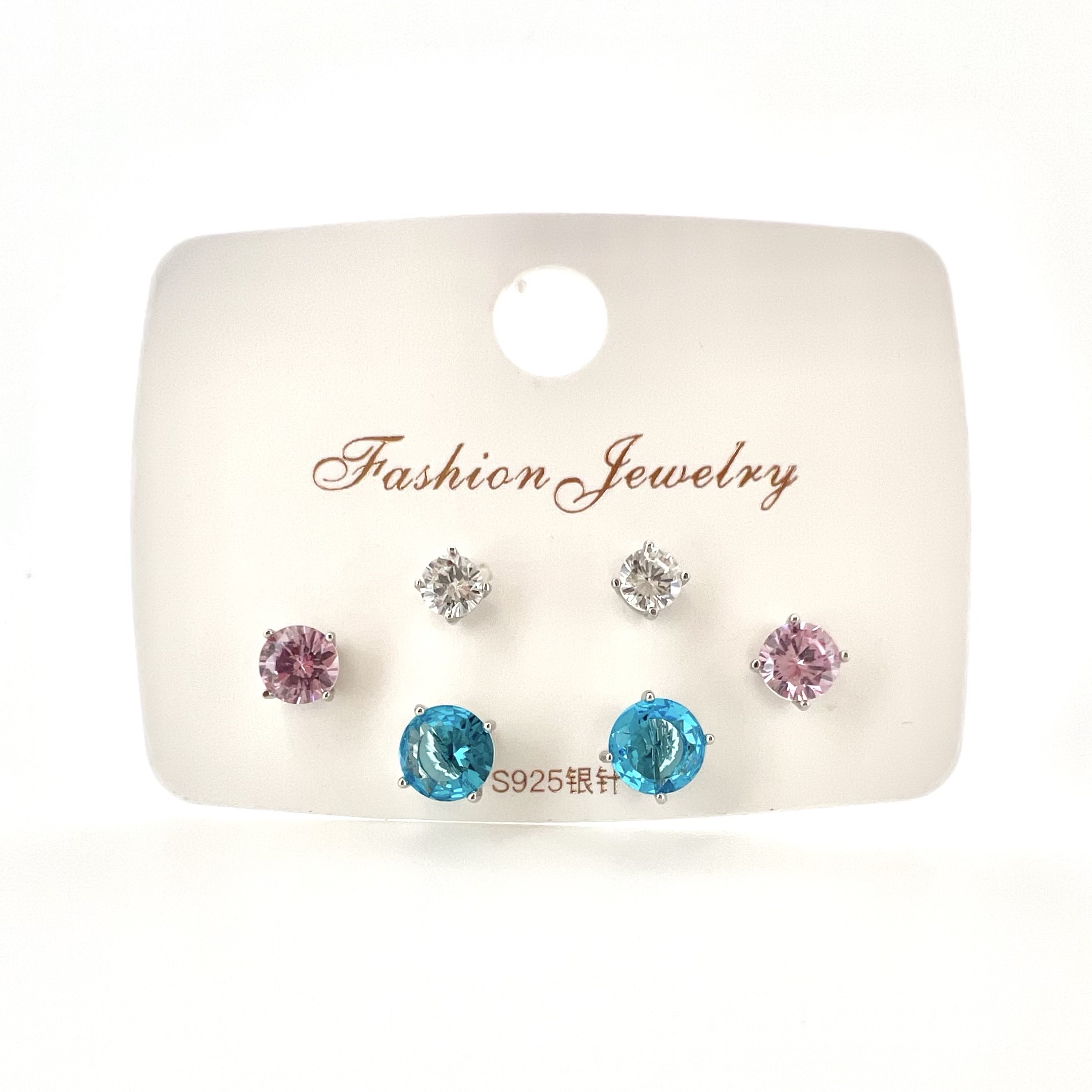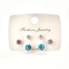 מארז של שלושה זוגות עגילים בצבע כחול, ורוד, ושקוף מרודיום איכותי
