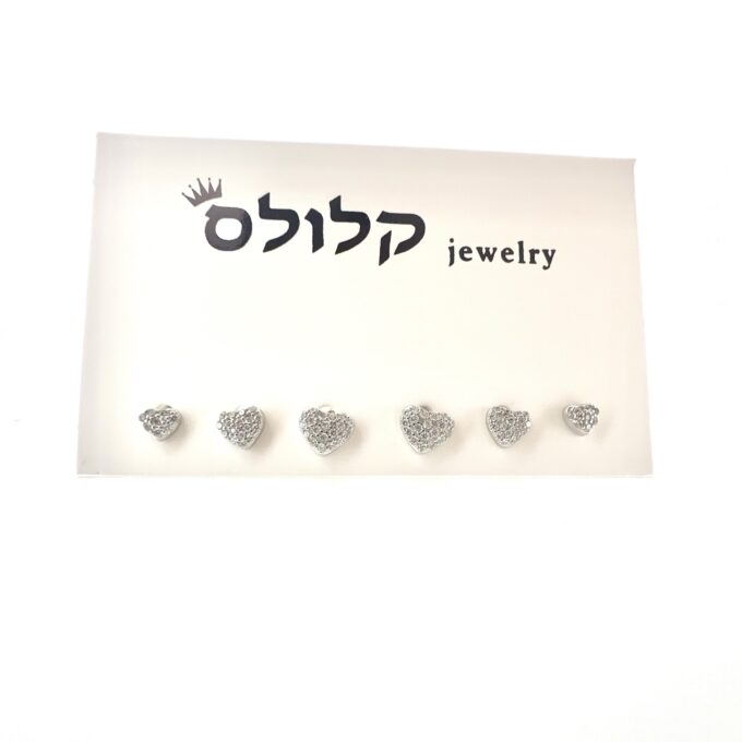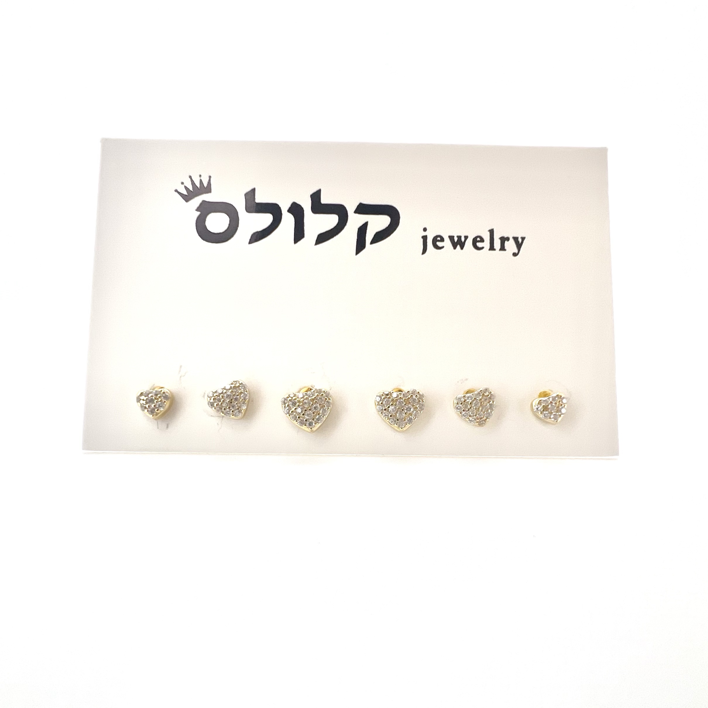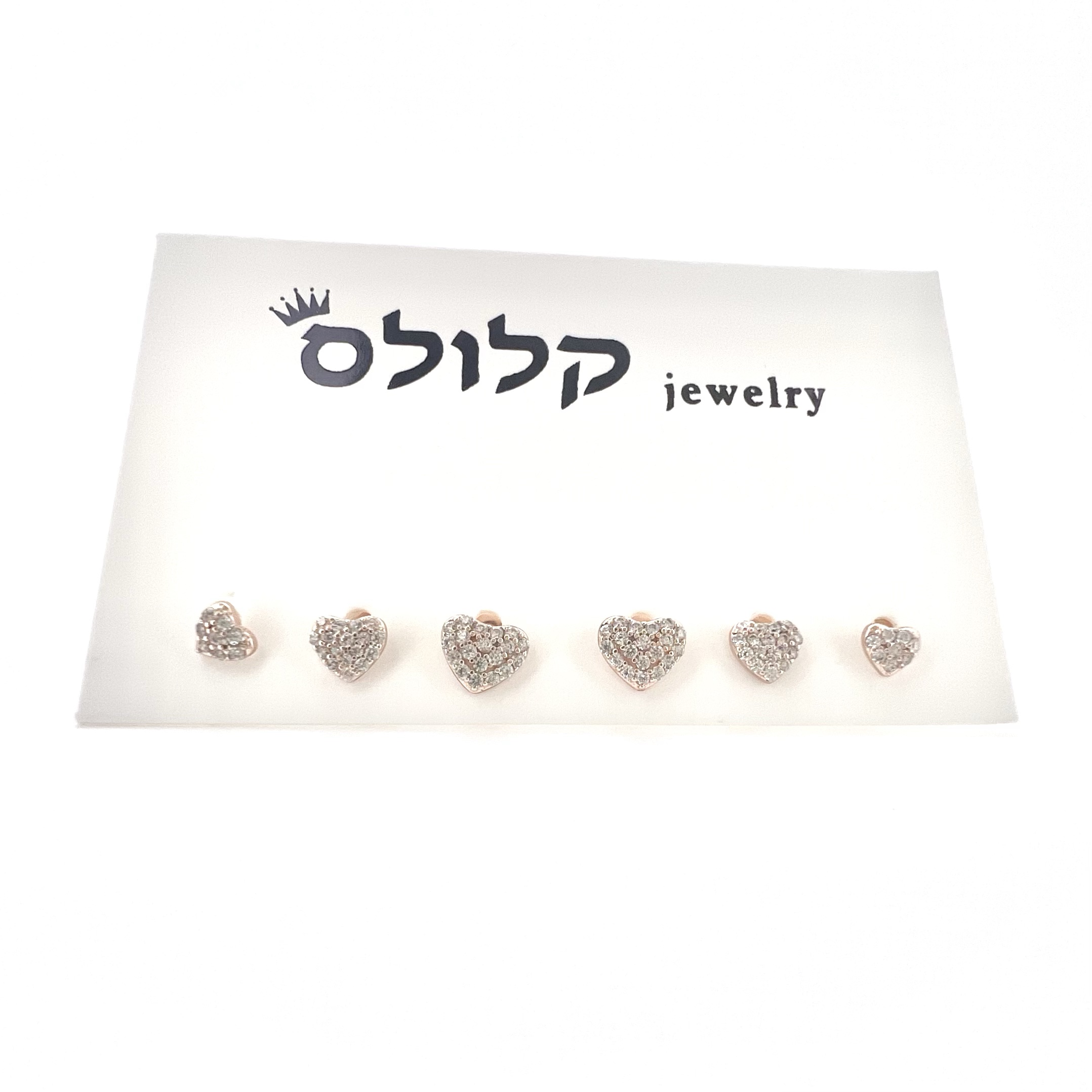 שלושה זוגות עגילים בצורת לב בשלושה גדלים שונים משובצים אבני זרקון מכסף אמיתי 925