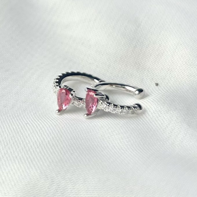 עגיל חישוק הליקס משובץ אבני זרקון ואבן זרקון בצורת טיפה בצבע ורוד מכסף אמיתי 925