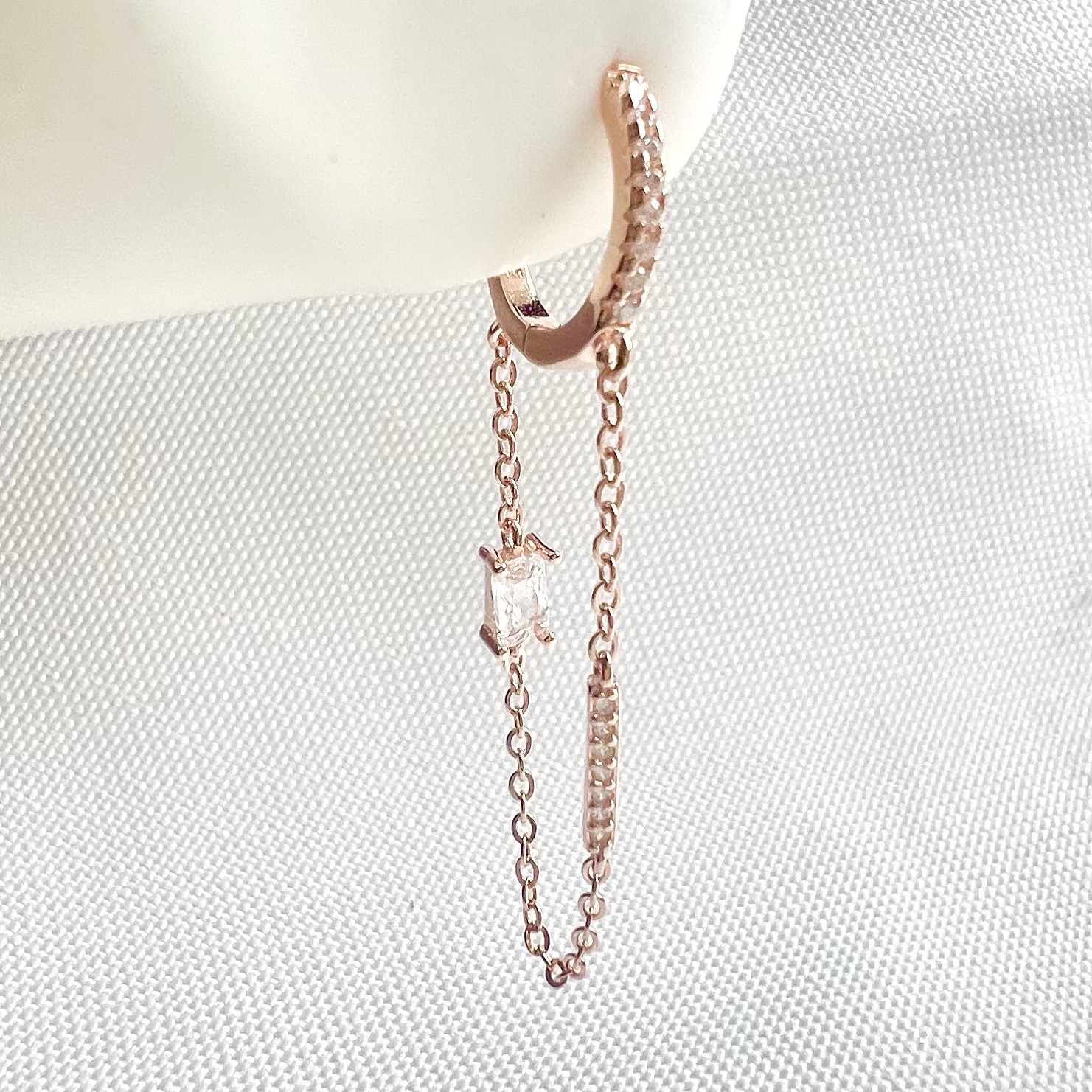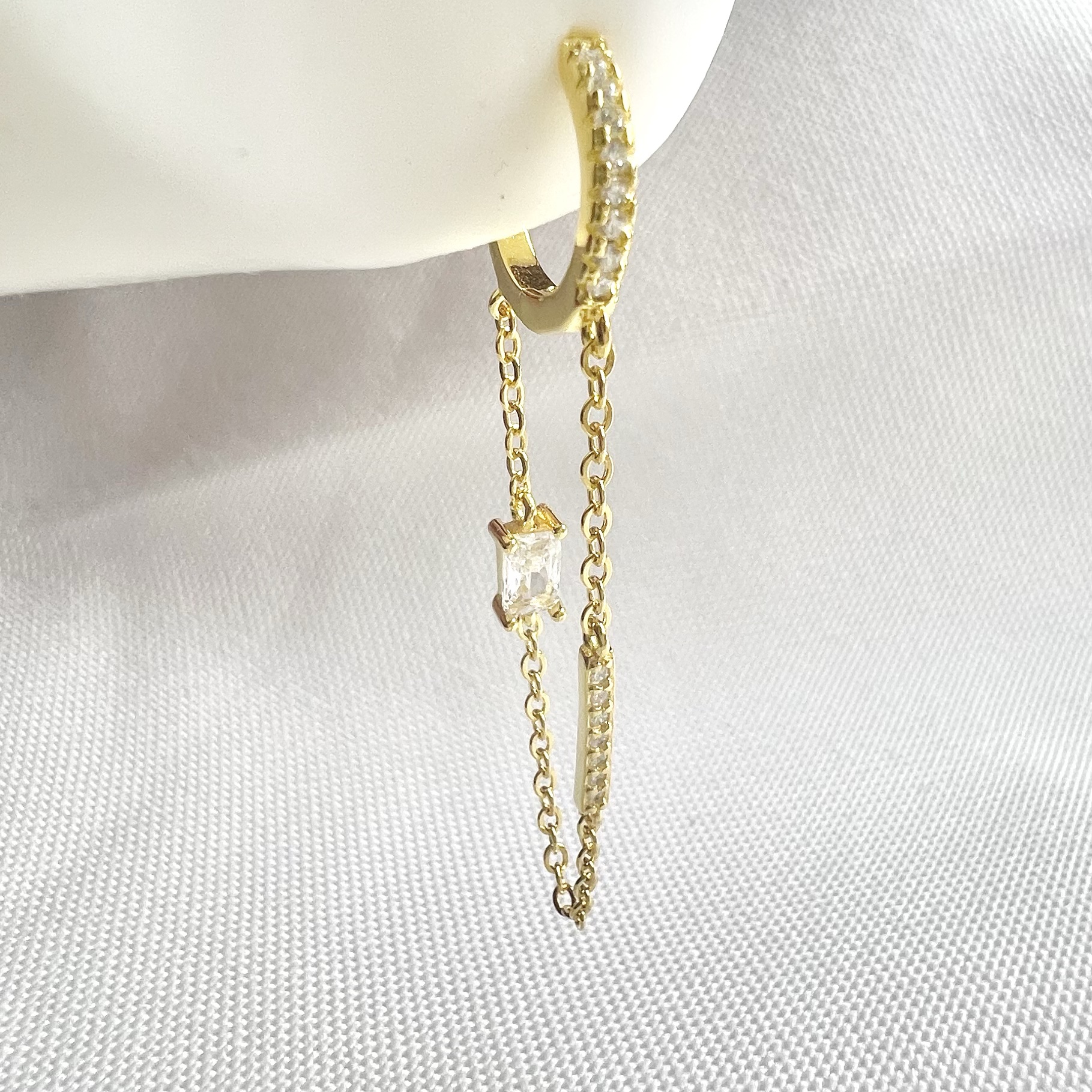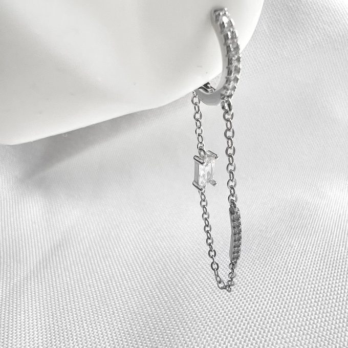 עגיל חישוק משובץ אבני זרקון עם שרשרת נופלת ואבן זרקון מלבנית במרכזה מכסף אמיתי 925