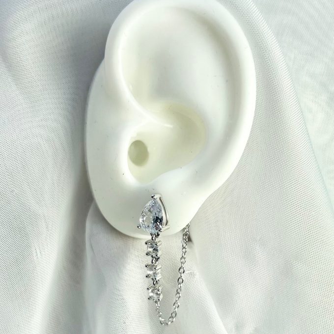 עגיל צמוד עם אבן זרקון בצורת טיפה גדולה מחוברת לשלוש אבני זרקון מרובעות נופלות מכסף אמיתי 925