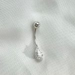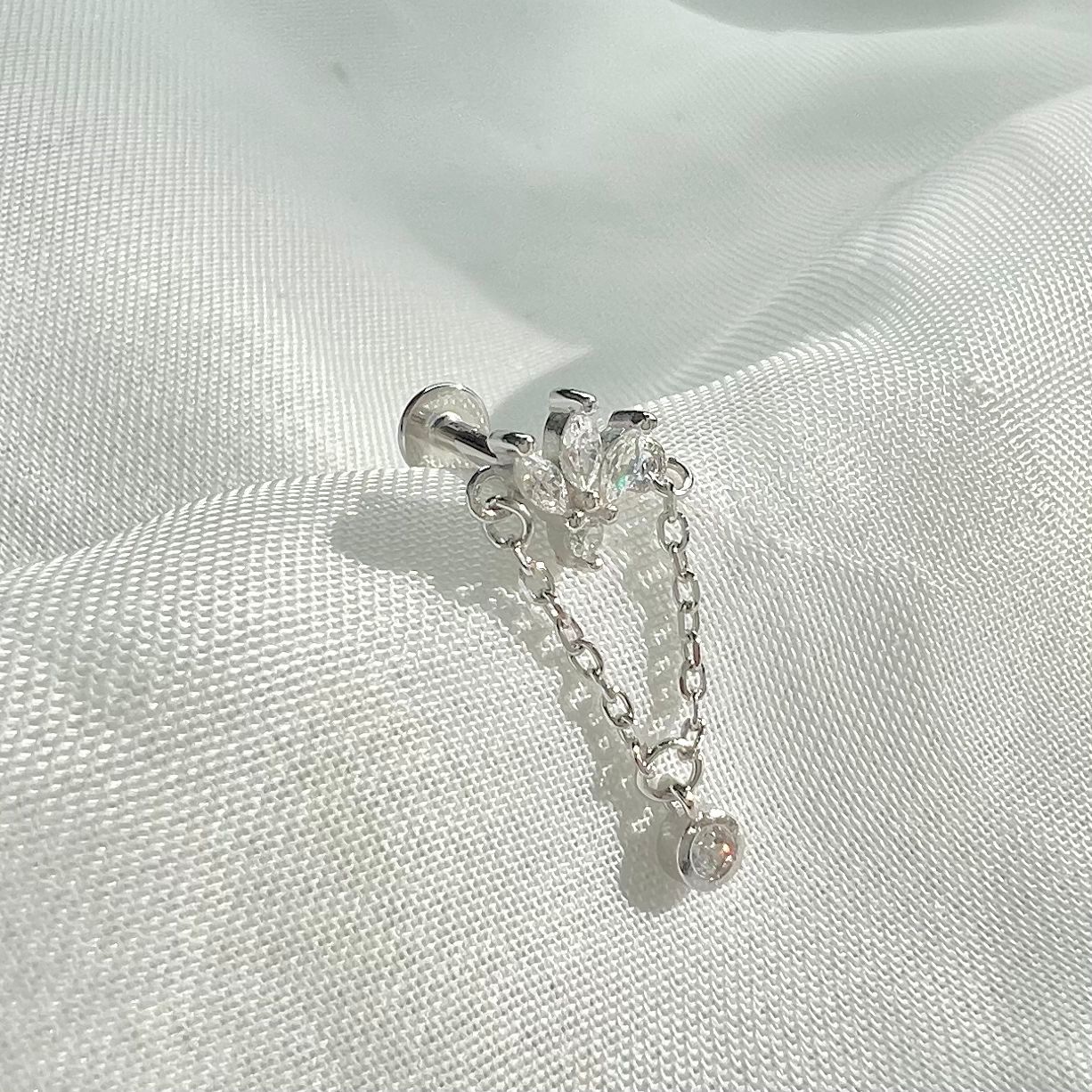 עגיל פירסינג מטיטניום עם אבני זרקון בצורת לוטוס שמחובר לשרשרת עם אבן זרקון עגולה נופלת