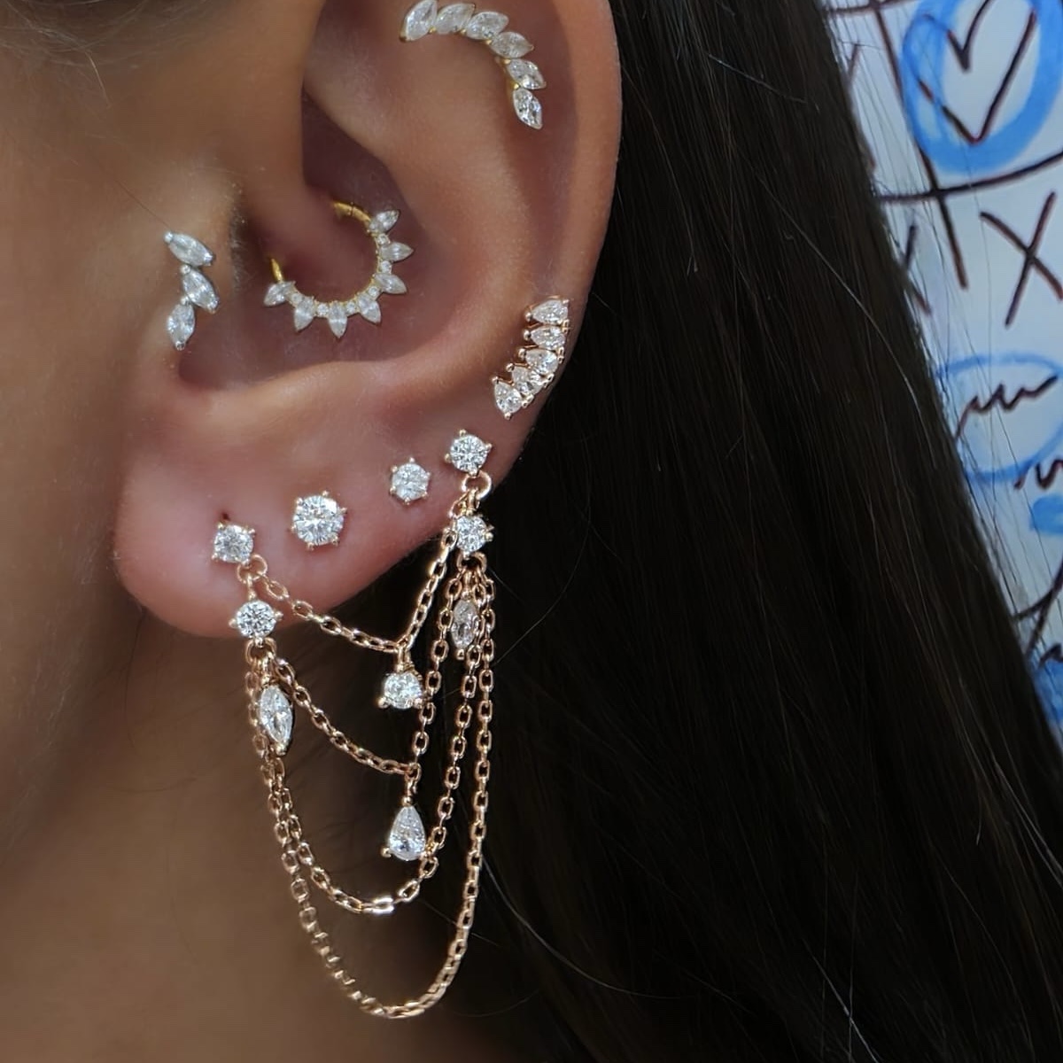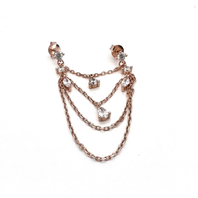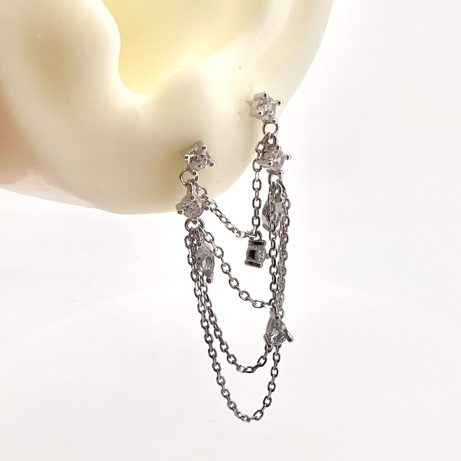 עגיל צמוד מחובר בשלושה שרשראות עם אבני זרקון תלויות עליו מכסף אמיתי 925