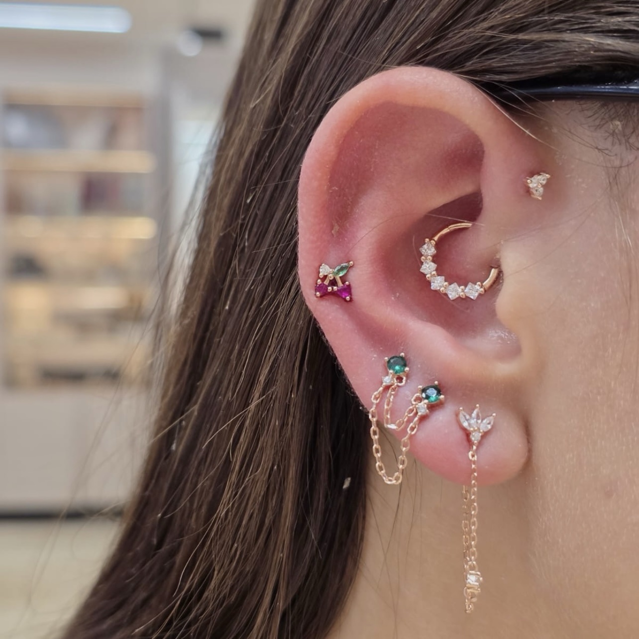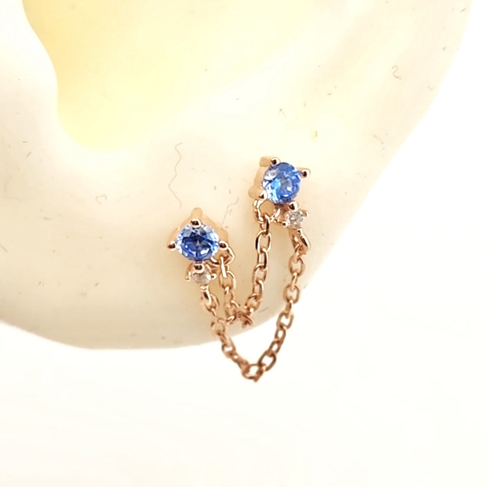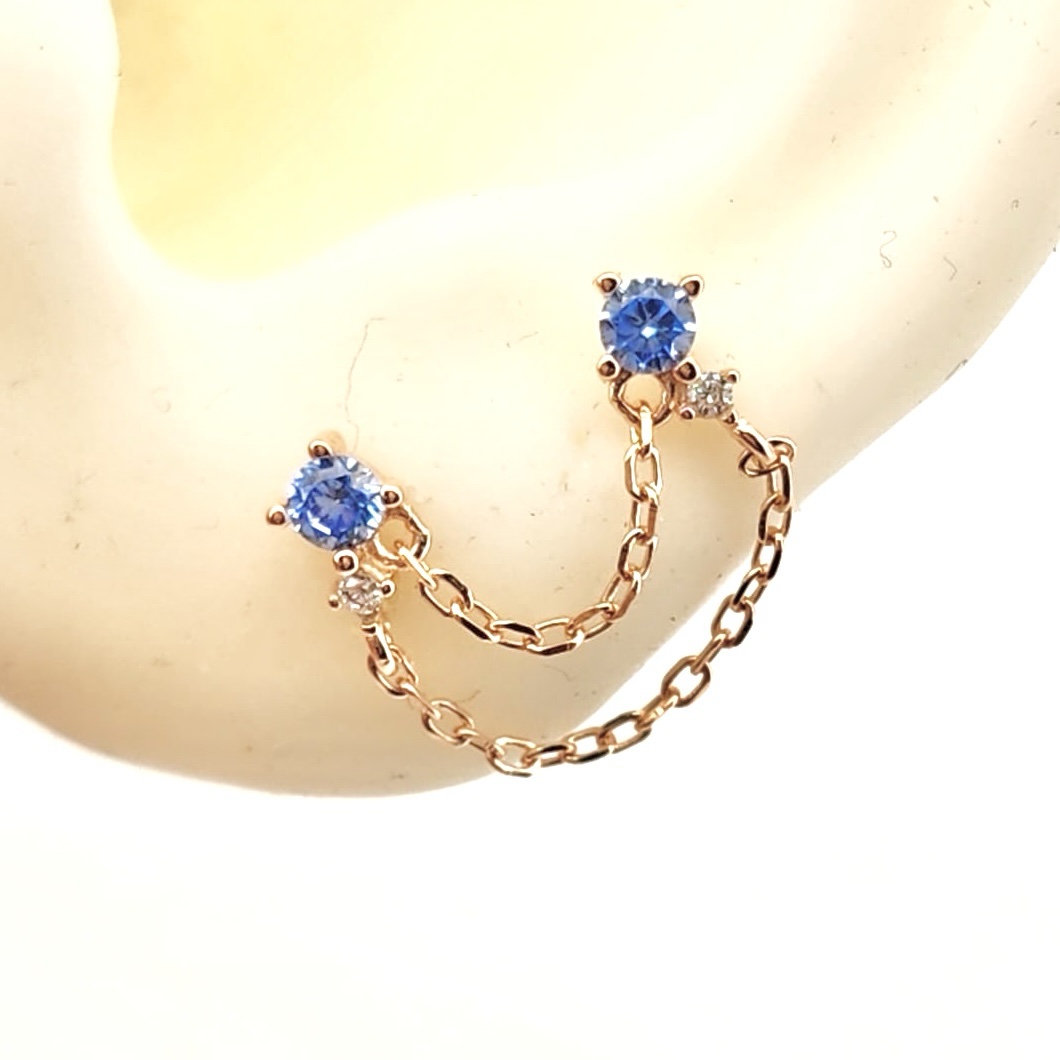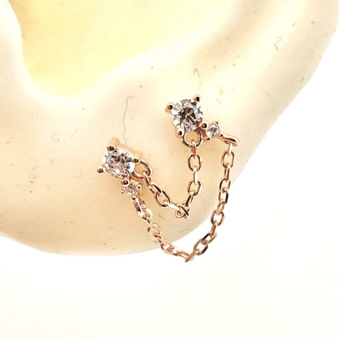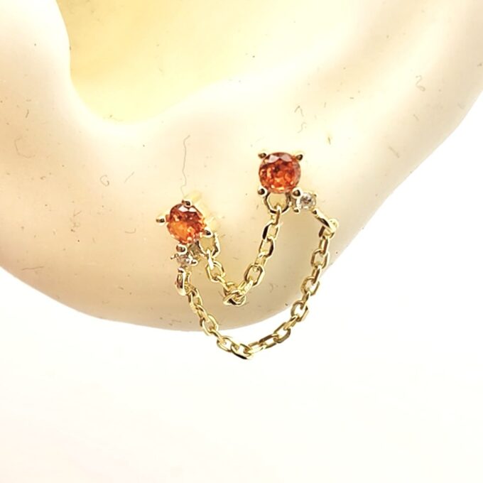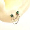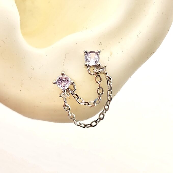 עגיל צמוד משובץ אבן זרקון במגוון צבעים מחובר בשתי שרשראות לעגיל צמוד תואם אליו מכסף אמיתי 925