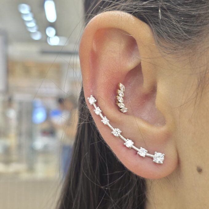 עגיל מחובר לחור אחד שנצמד לכל אורך האוזן משובץ אבני זרקון