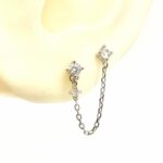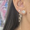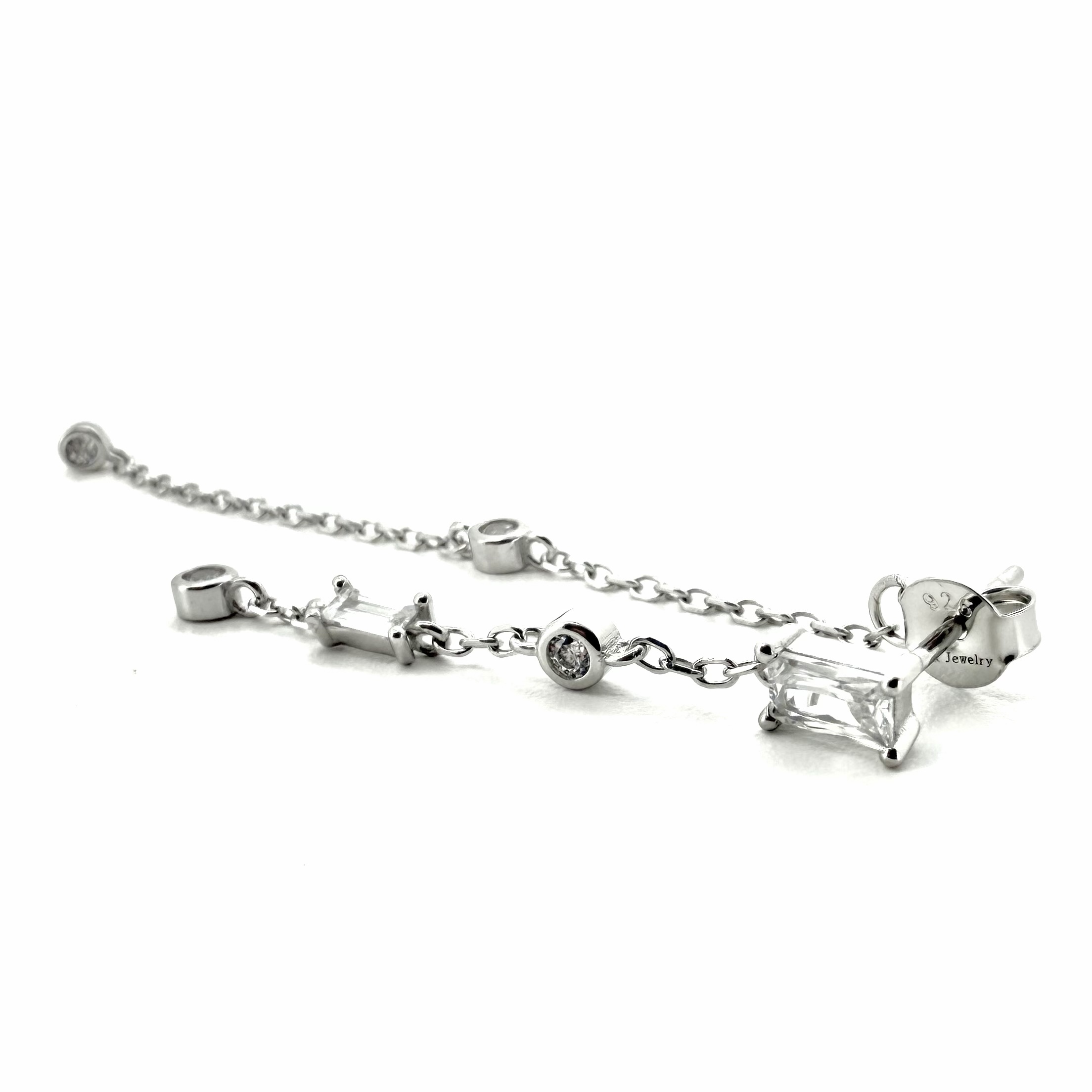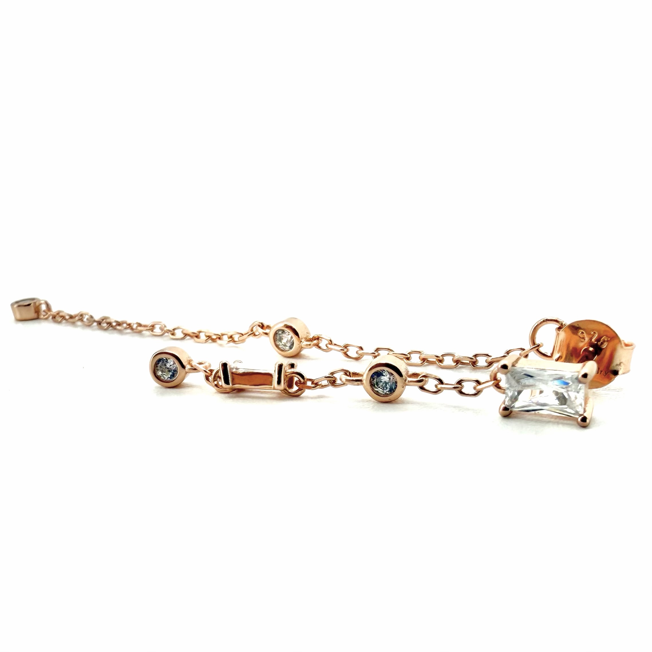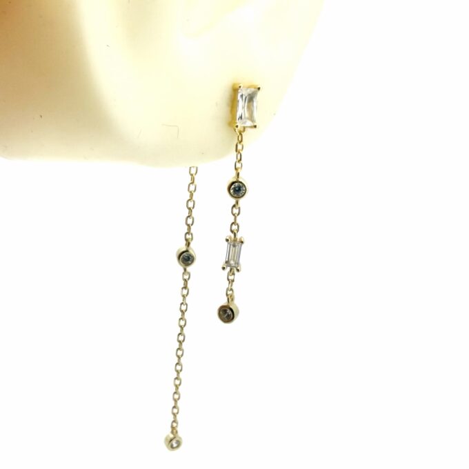 עגיל צמוד משובץ אבן זרקון בצורת מלבן עם אבנים נופלות ושרשרת נופלות על אבני זרקון מהסוגר