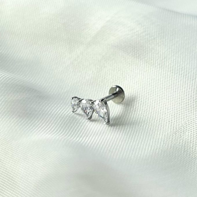 עגיל פירסינג עם סגירה מסתובבת משובץ שלוש אבני זרקון מדורגות בצורת טיפה מטיטניום
