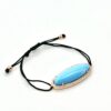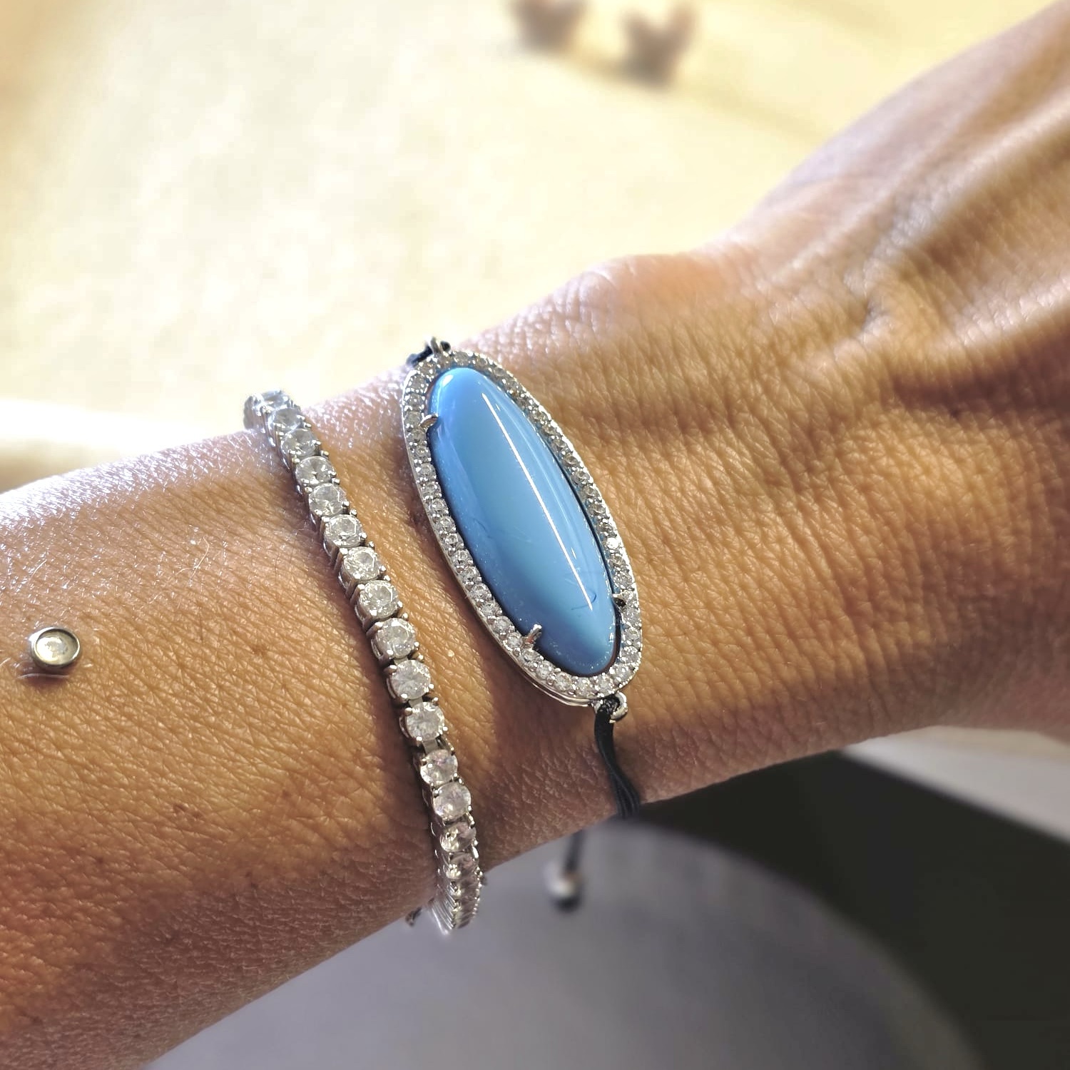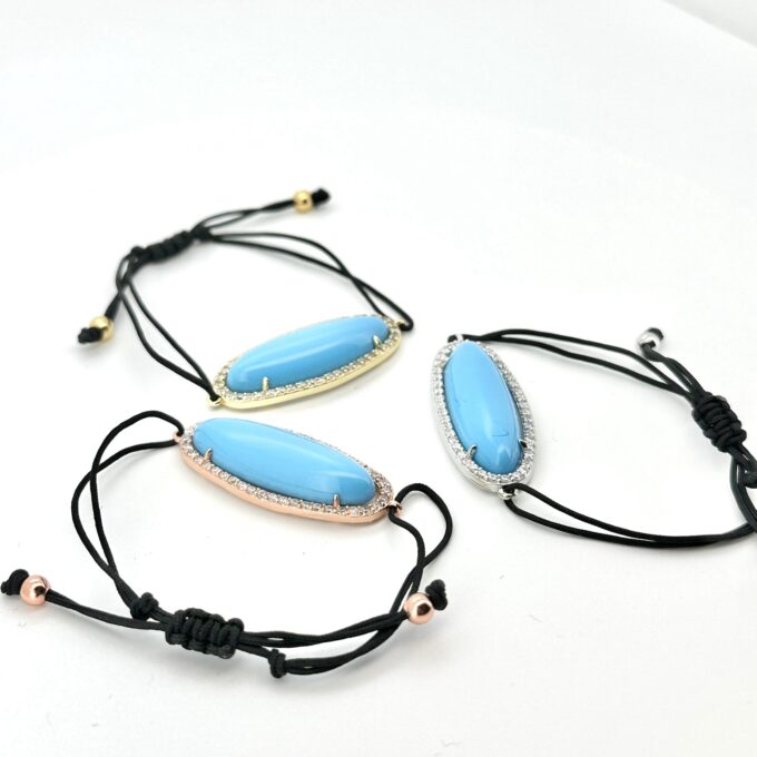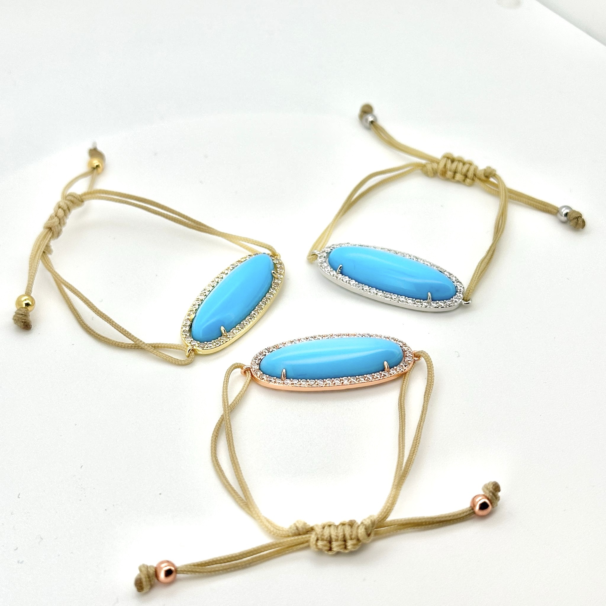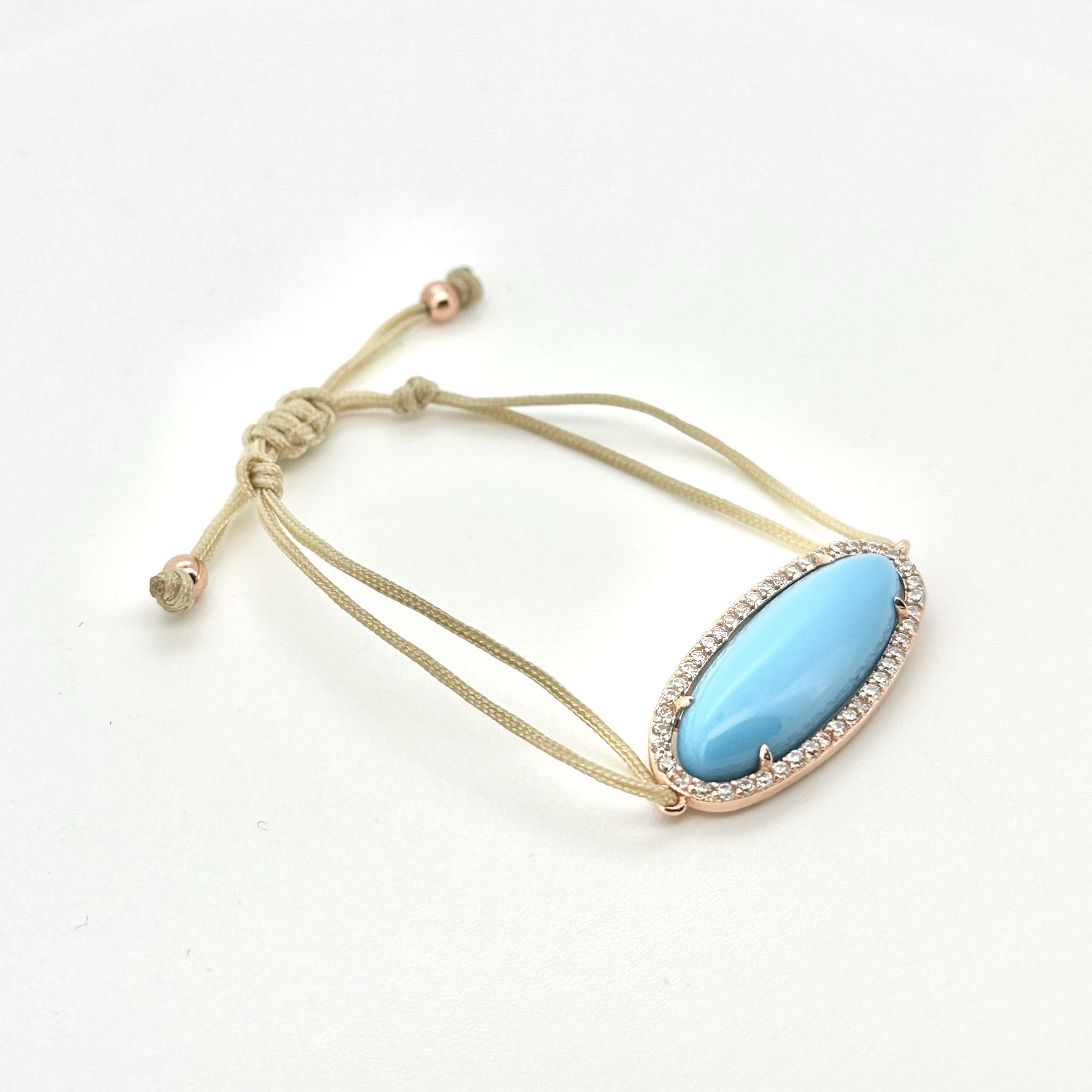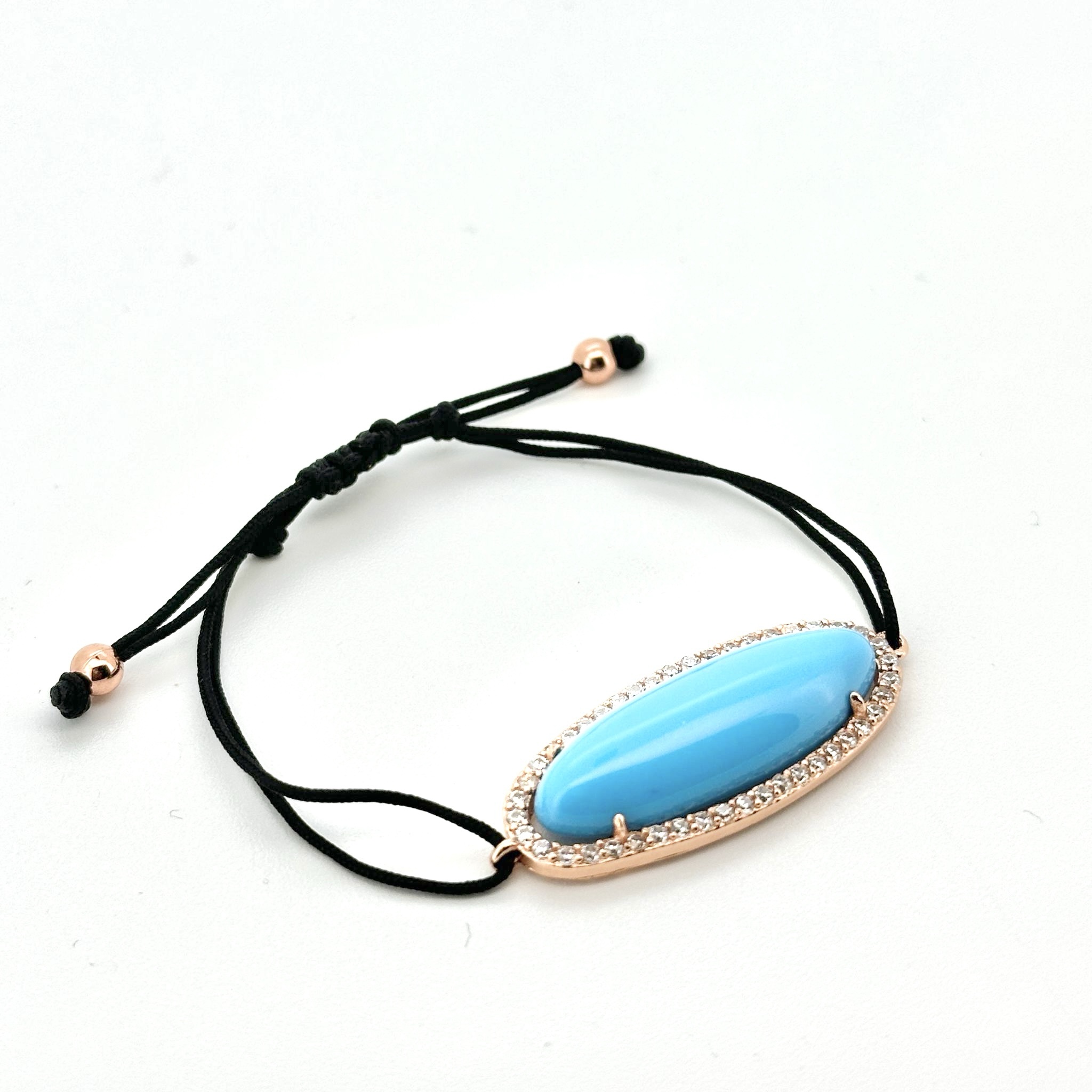 צמיד חוט איכותי תאים למידות 14-16 (s-m) עם תליון אבן אובלית בצבע טורקיז משובצת אבני זרקון מסביב מרודיום איכותי