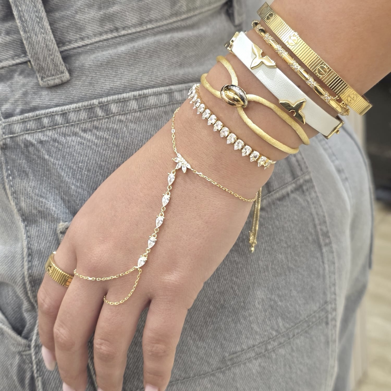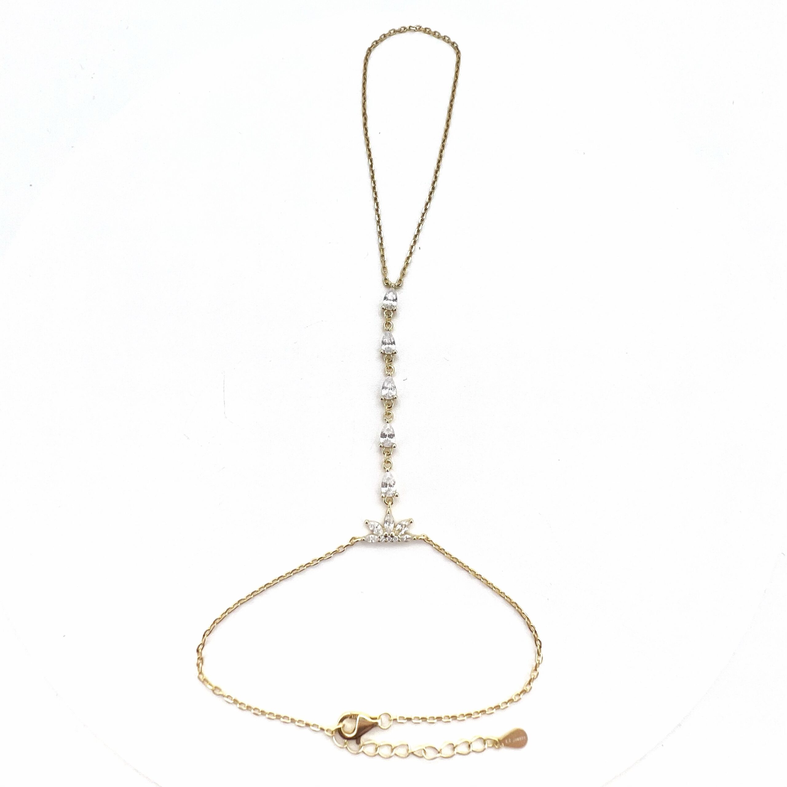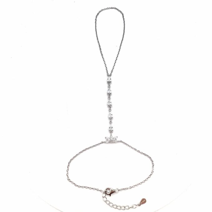 צמיד מחובר לטבעת עם תליון אבני זרקון בצורת לוטוס במרכז ואבני זרקון בצורת טיפה