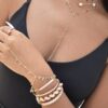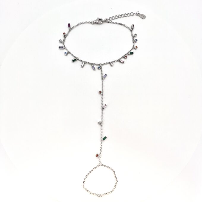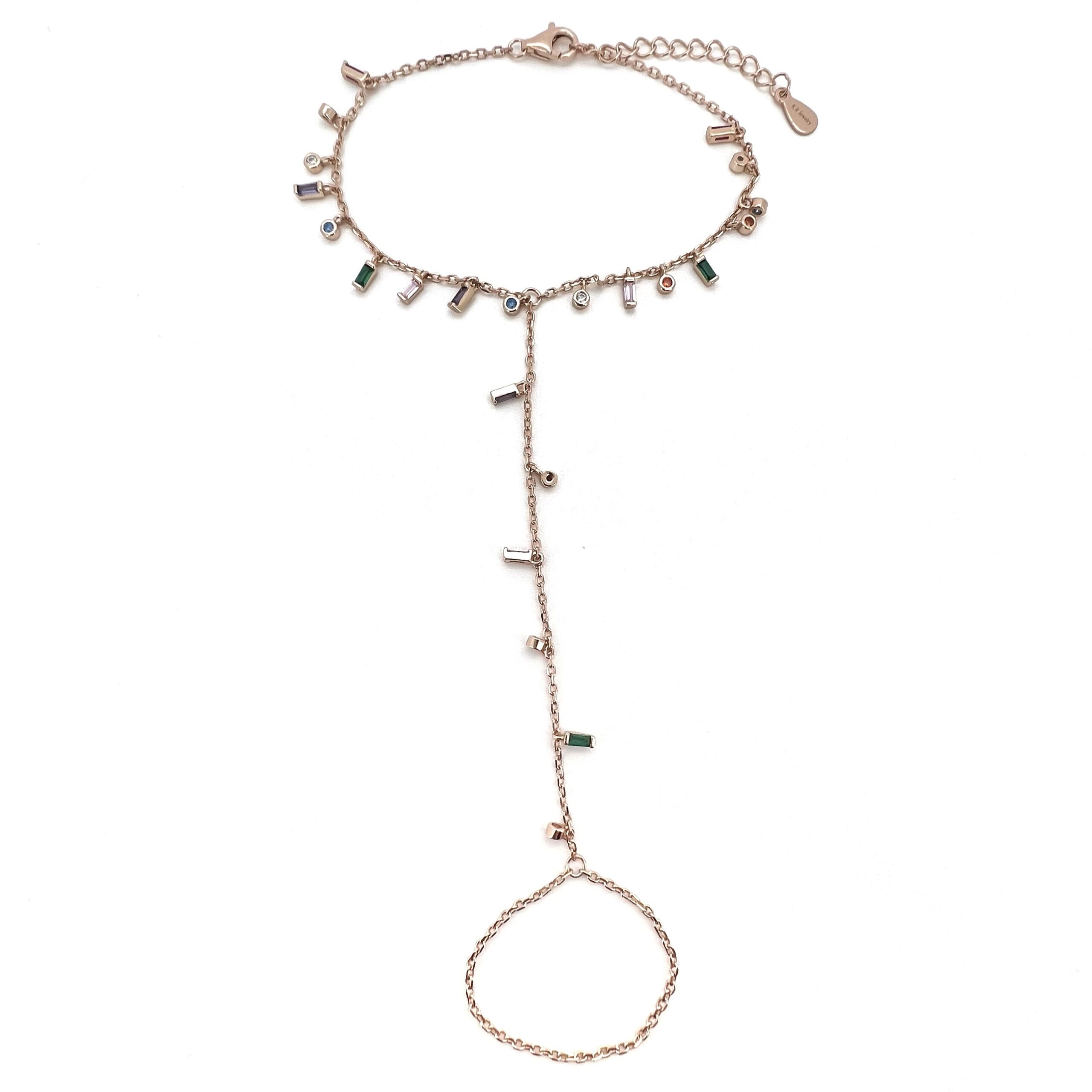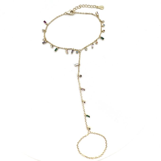 צמיד מחובר לטבעת עם תליוני אבני זרקון מלבניים צבעונים
