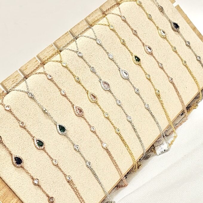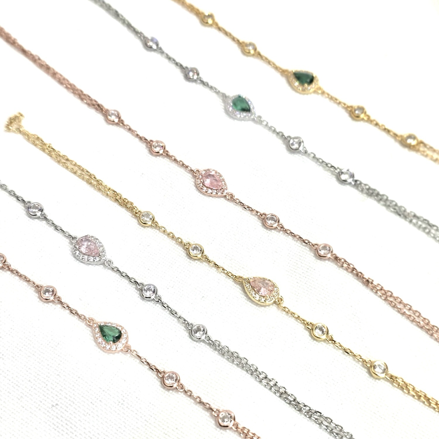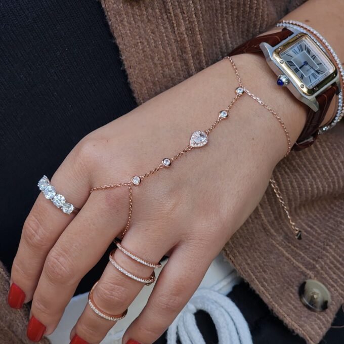 צמיד מחובר לטבעת עם אבני זרקון קטנים לאורכה ואבן זרקון בצורת טיפה משובצת מסביב מכסף אמיתי 925