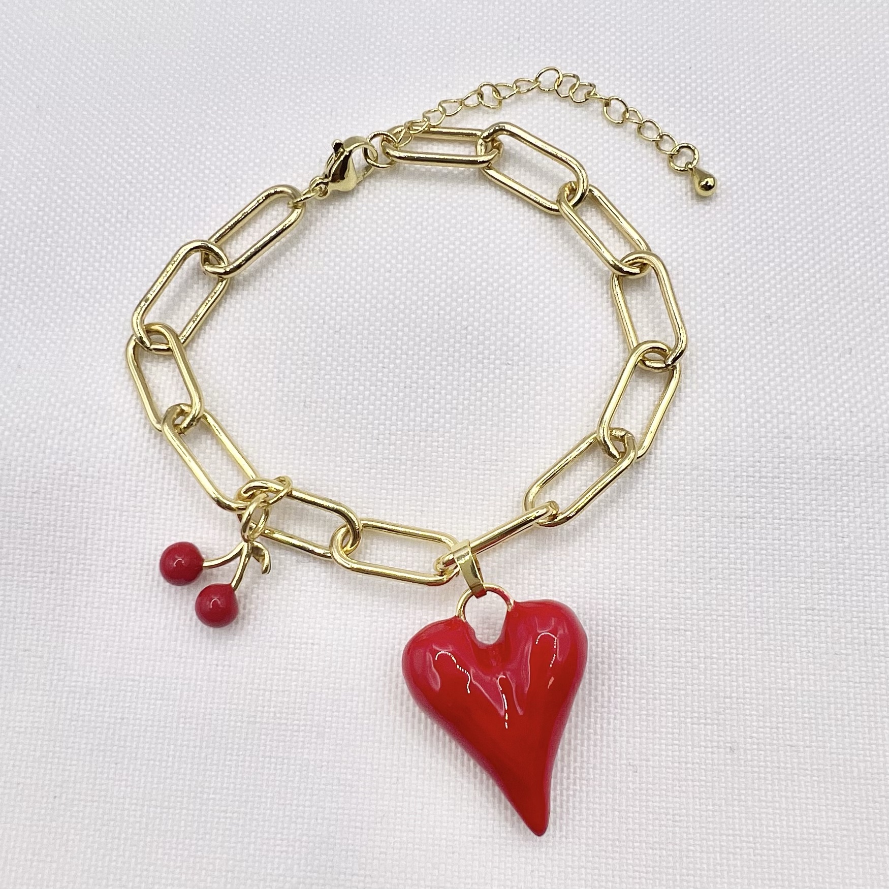 צמיד חוליות מרודיום איכותי עם תליון לב מציאותי ותליון דובדבנים קטן