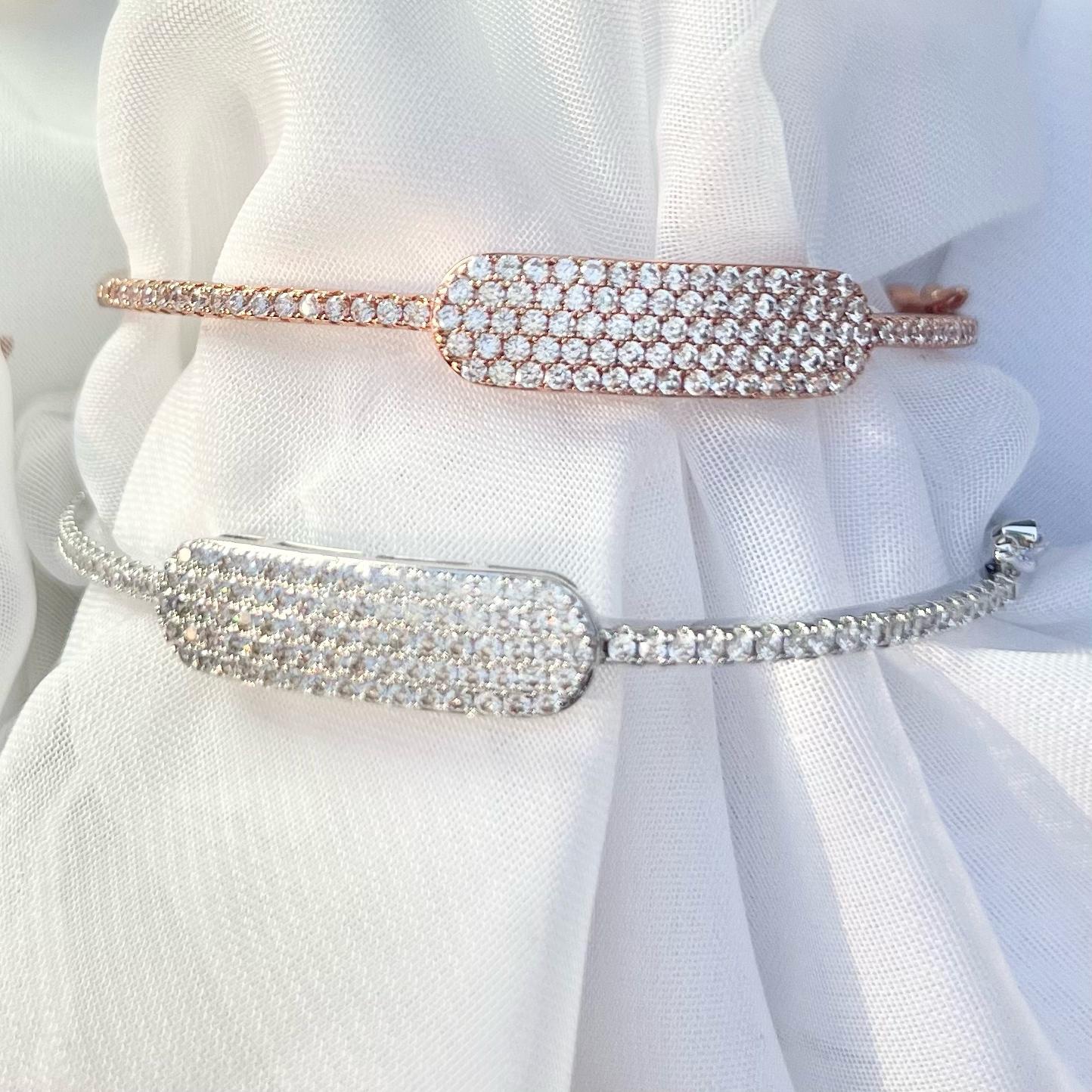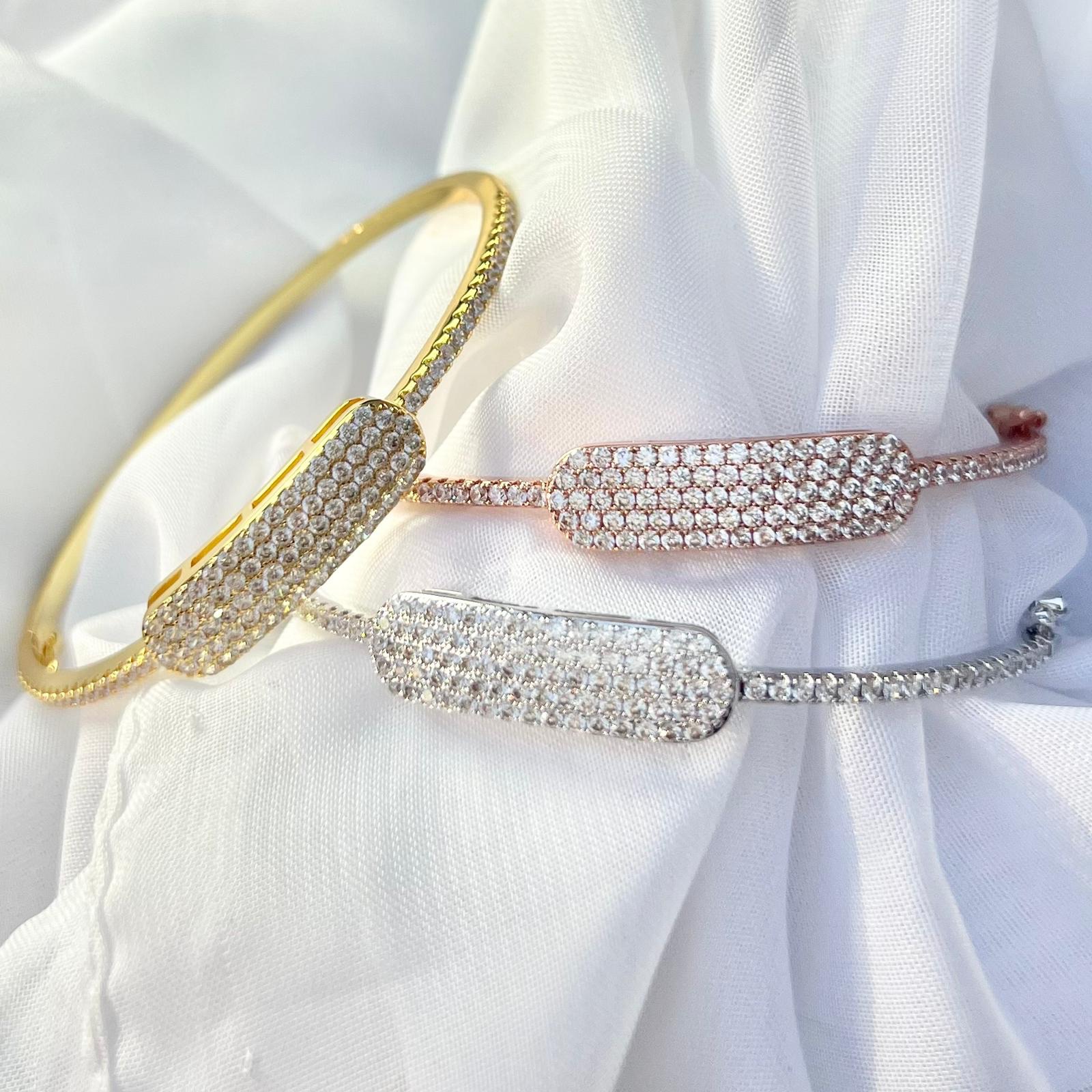 צמיד קשיח עם פלטה מעוגלת משובצת אבני זרקון מרודיום איכותי