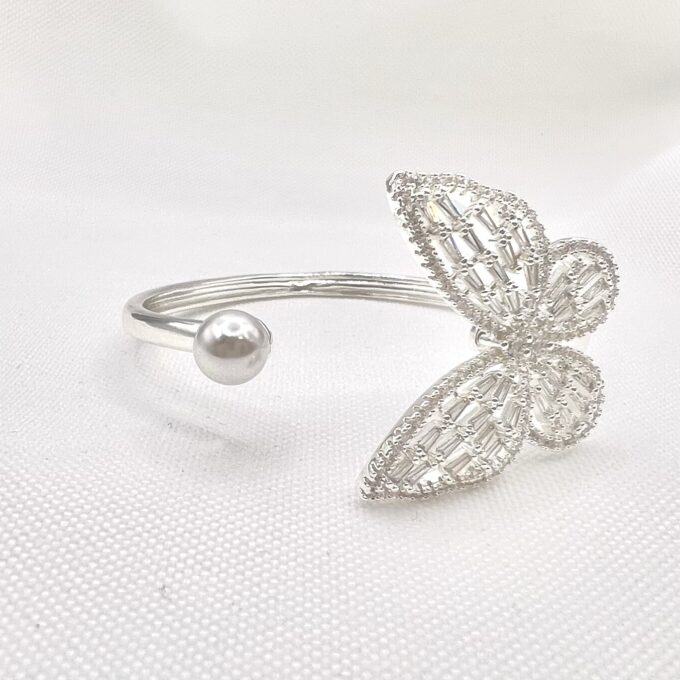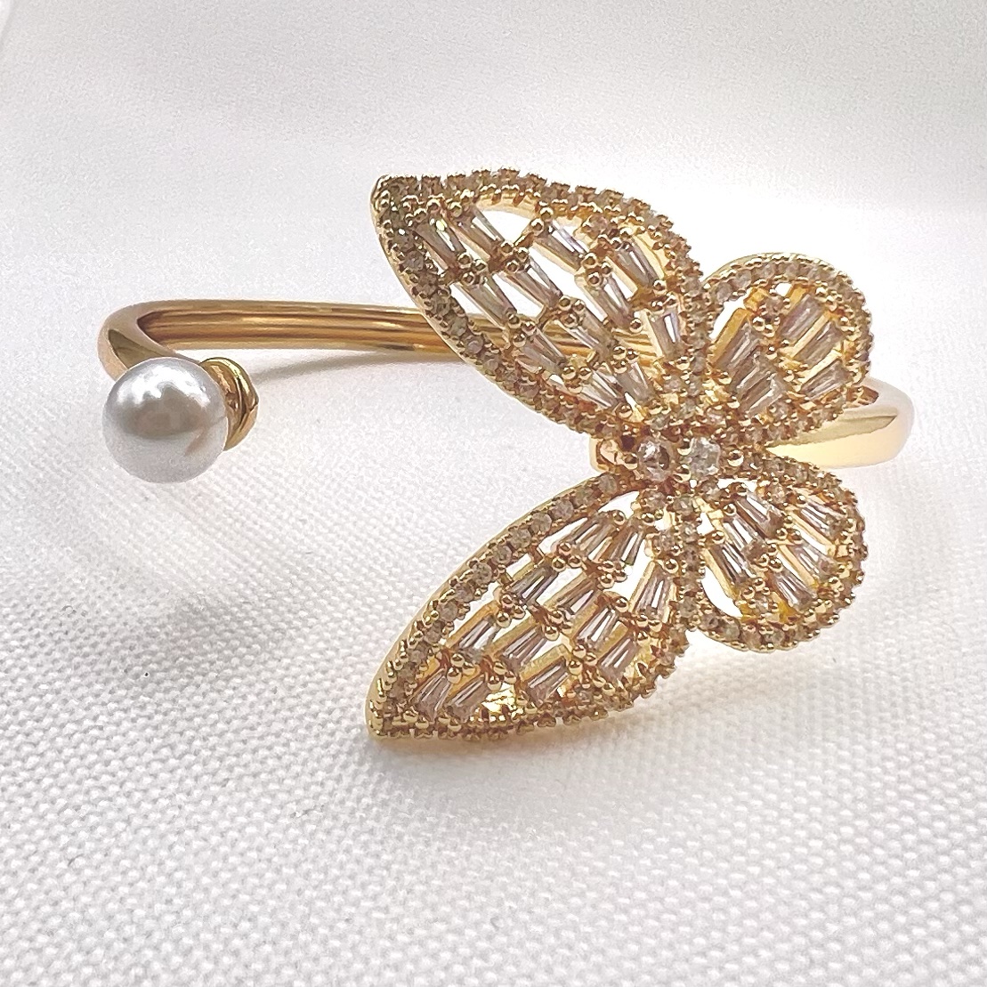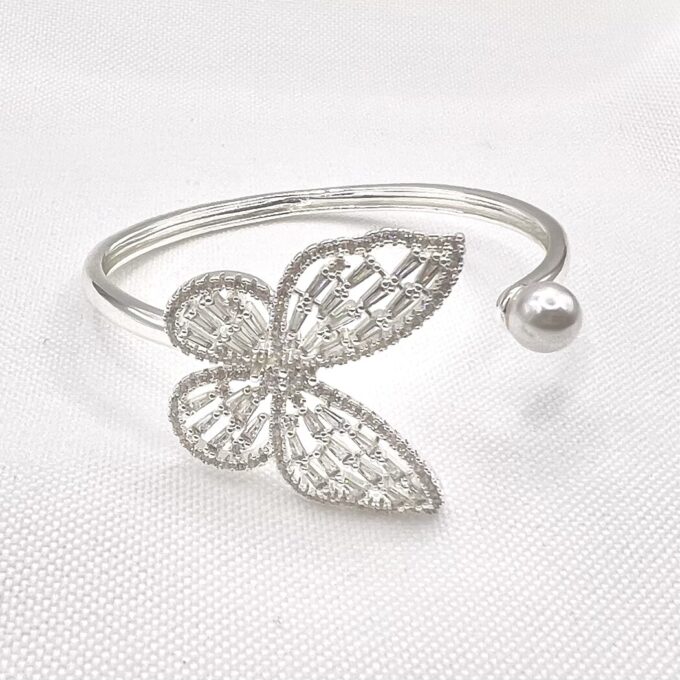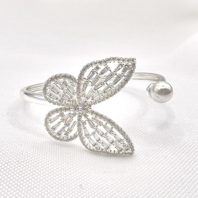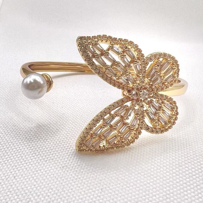 צמיד שמותאם לכל מידת יד (נפתח ונסגר) שבצד אחד פרפר משובץ אבני זרקון ובצידו השני אבן פנינה מרודיום איכותי