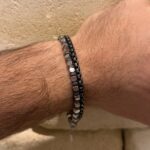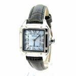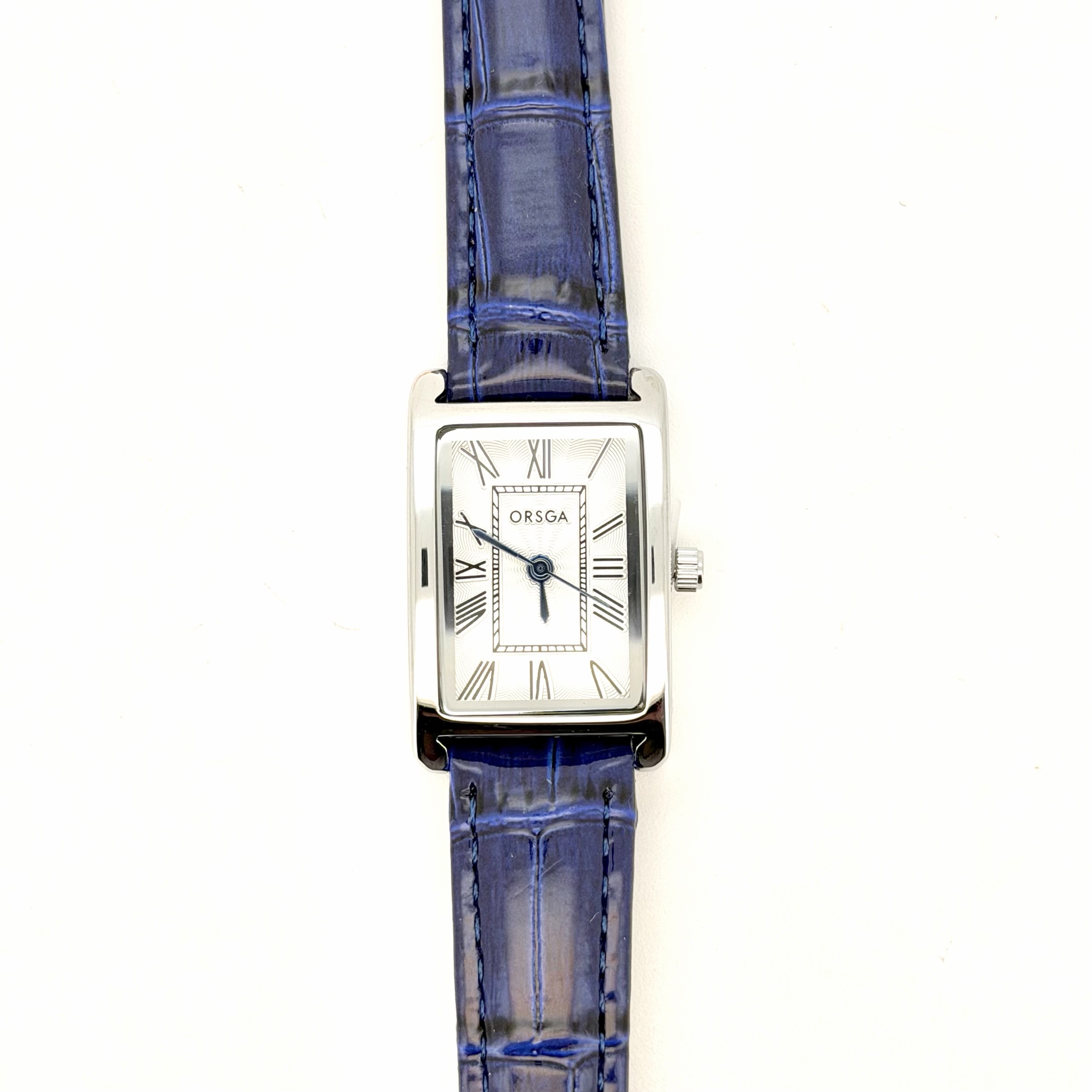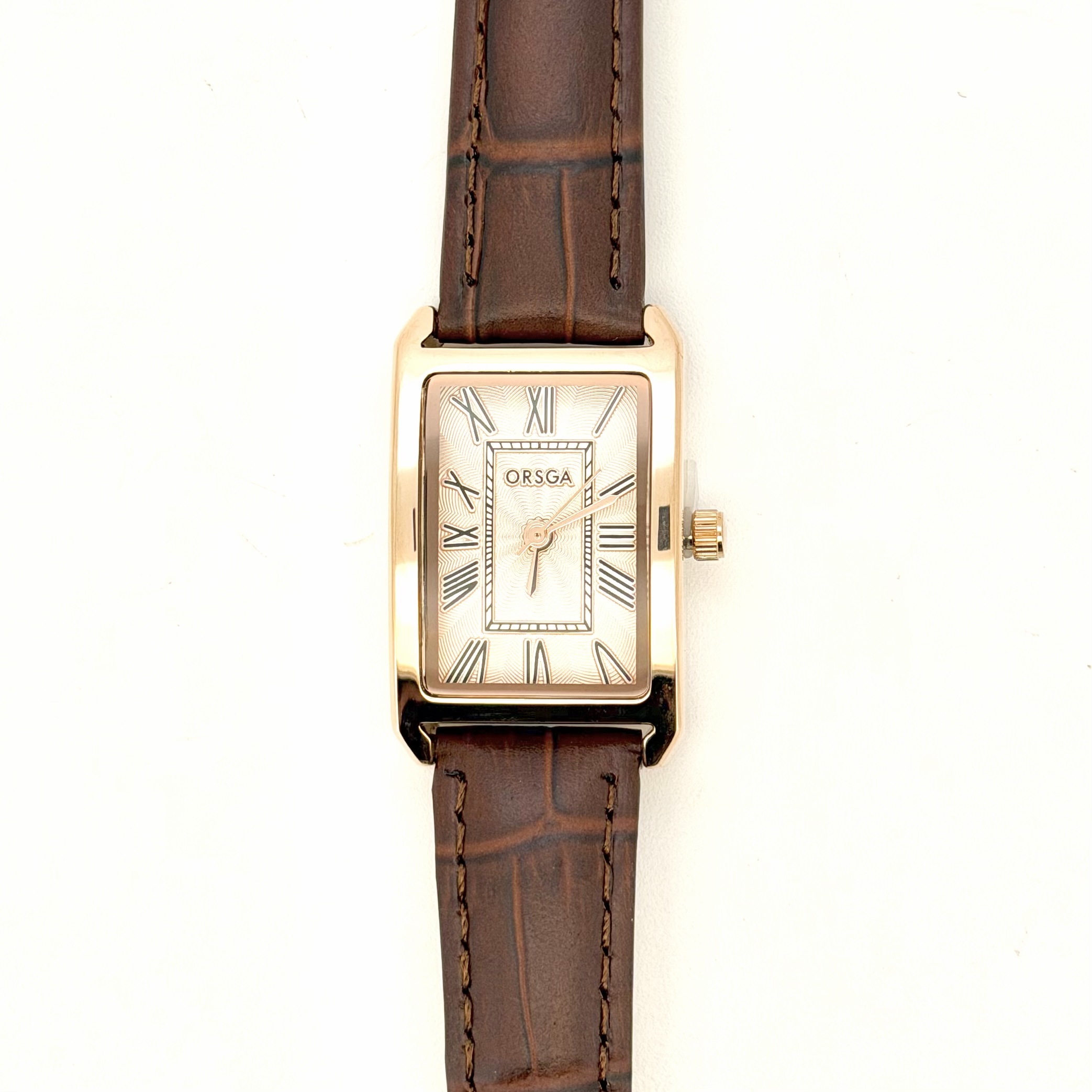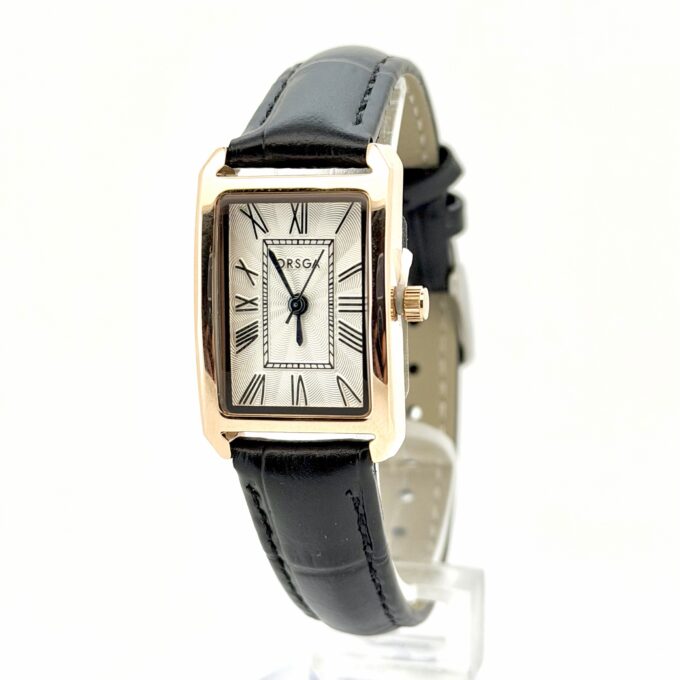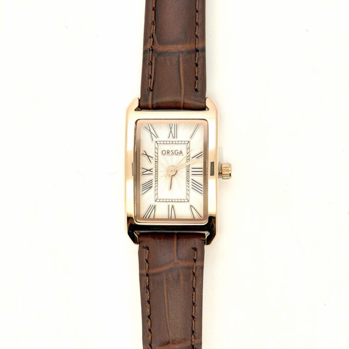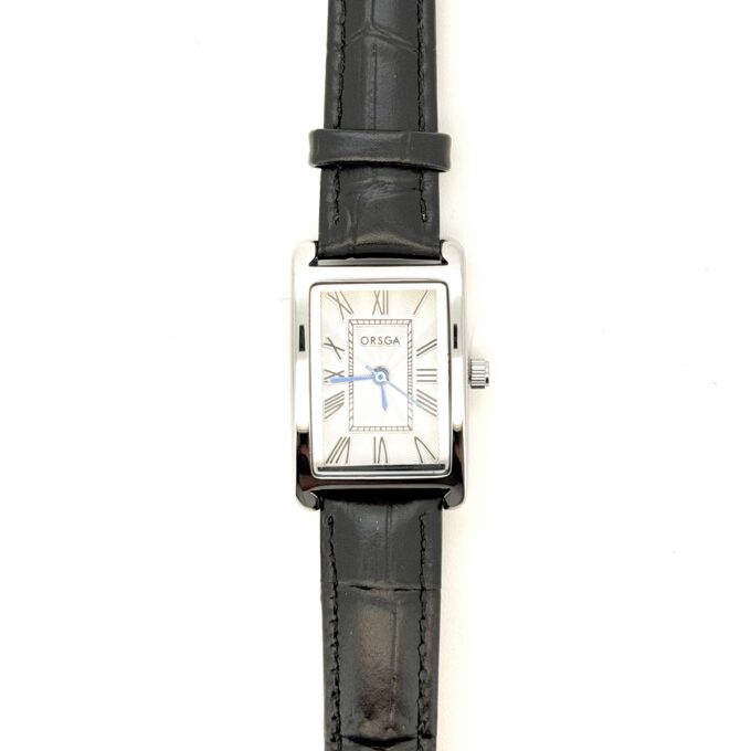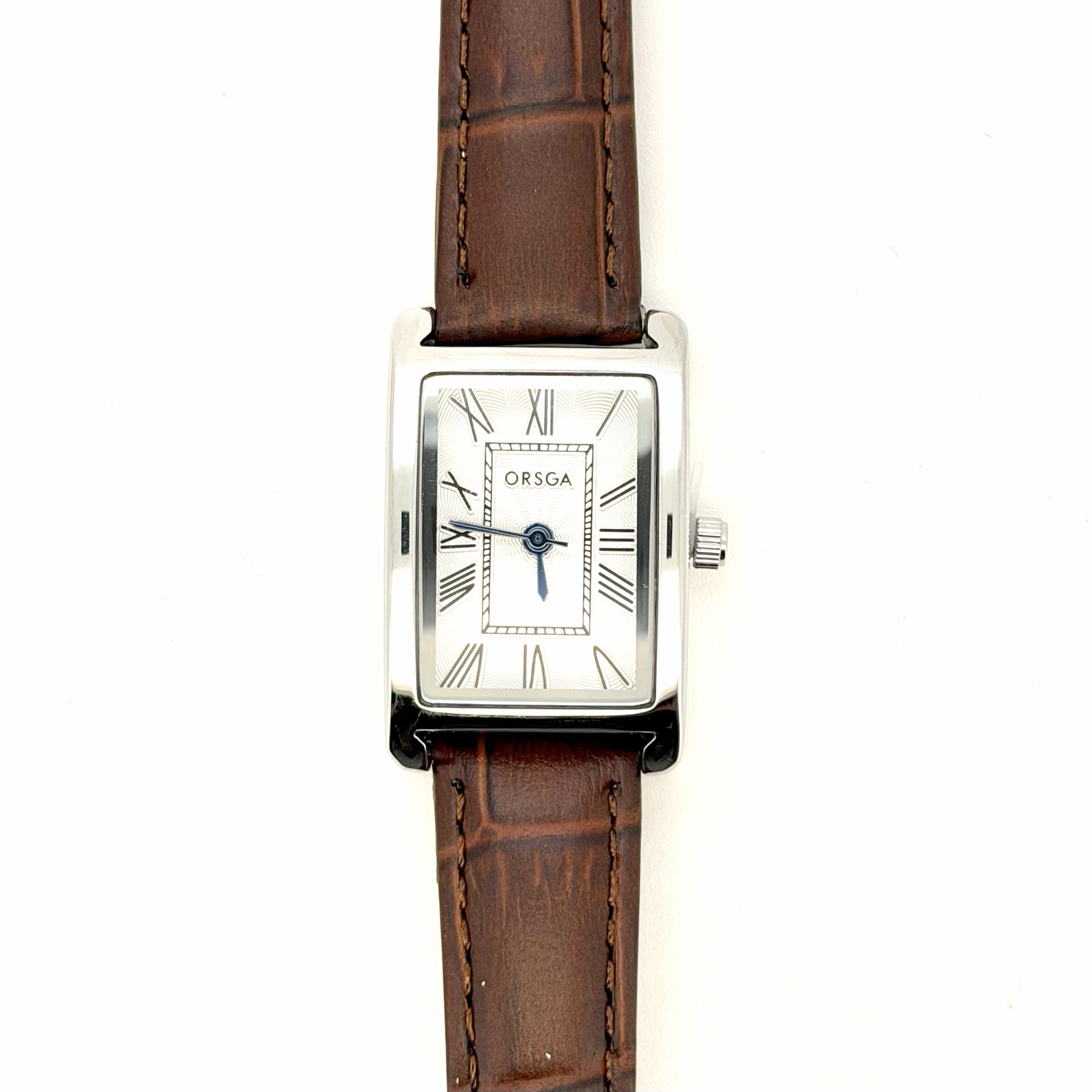 שעון עם רצועת עור ולוח מלבני שעובד על בטריה