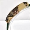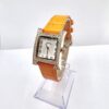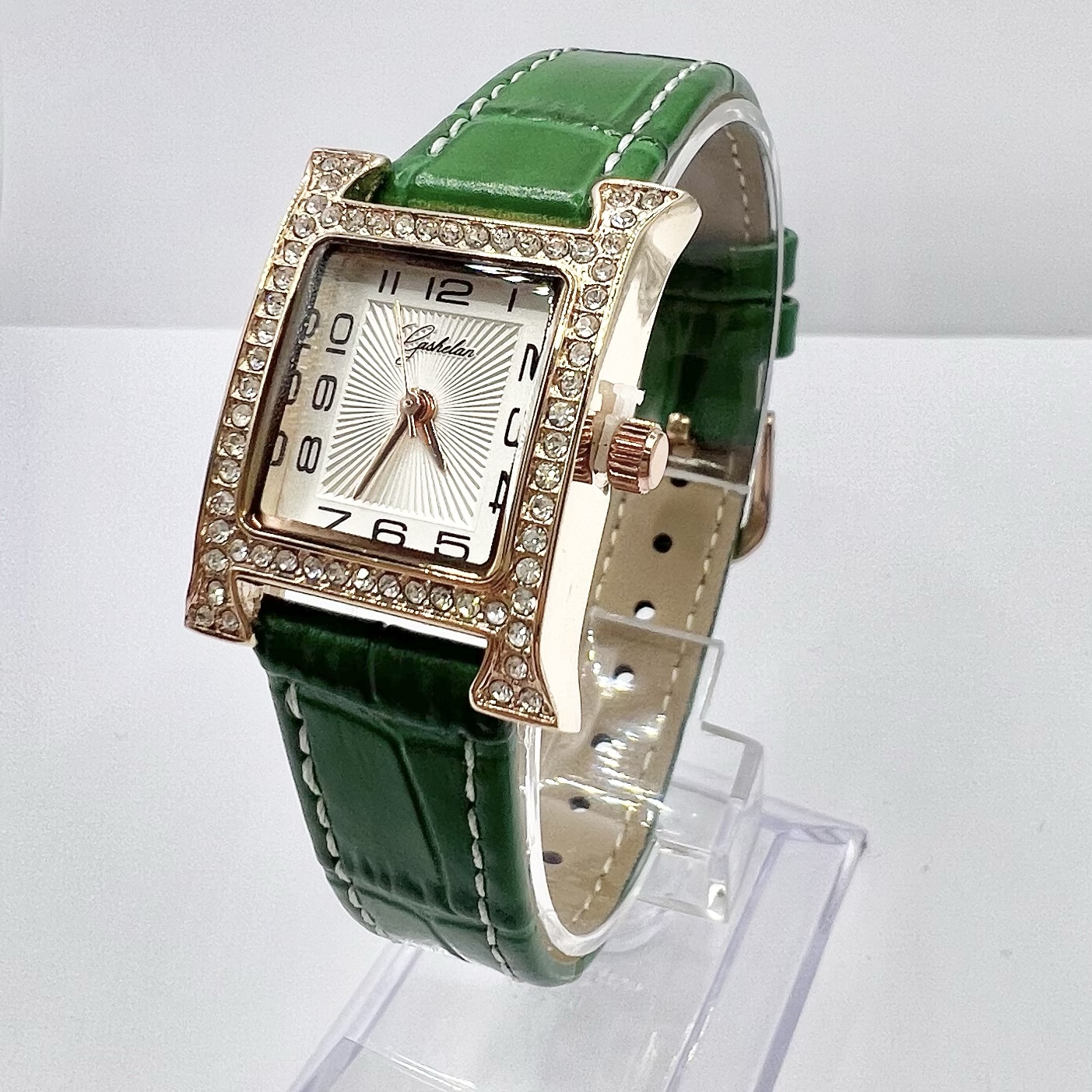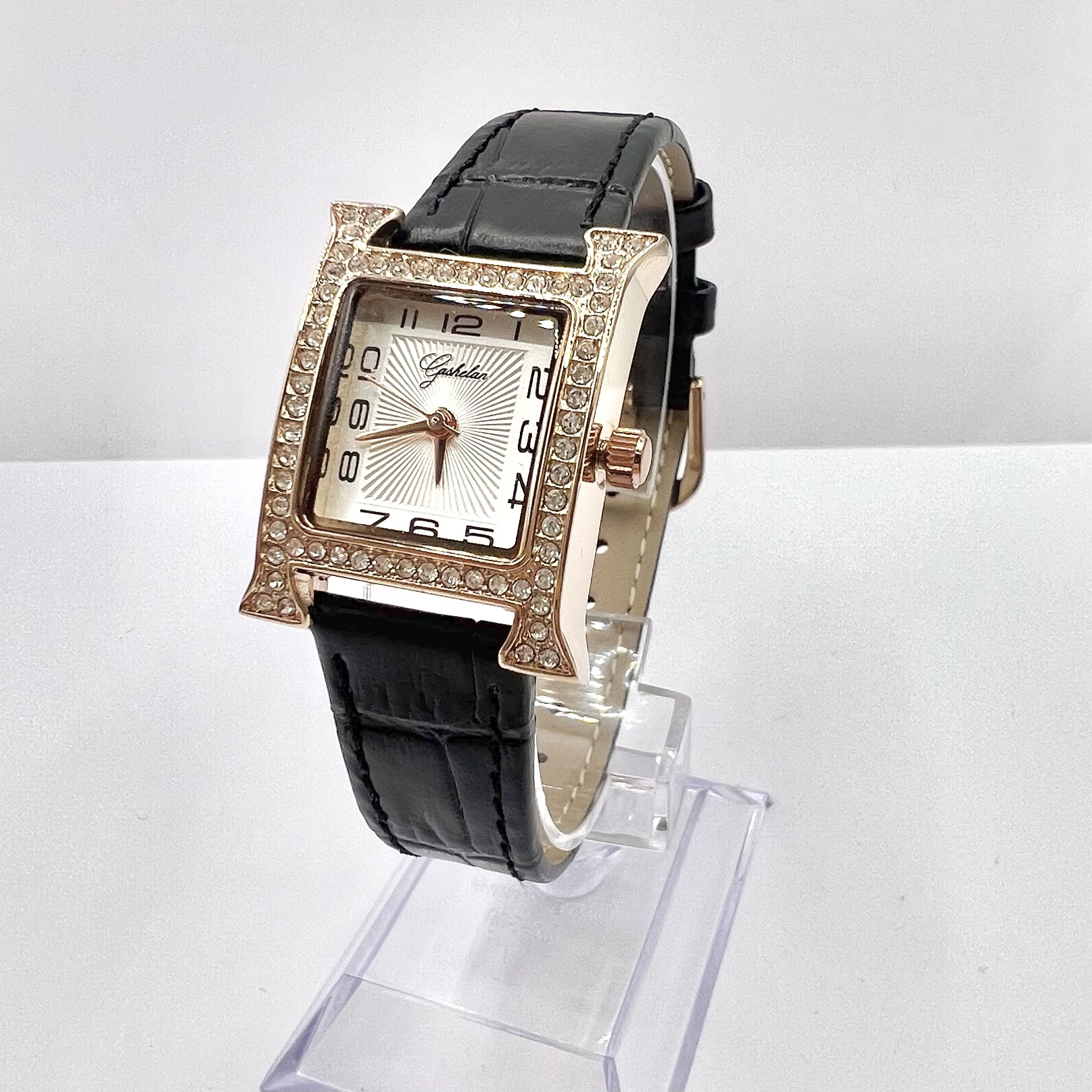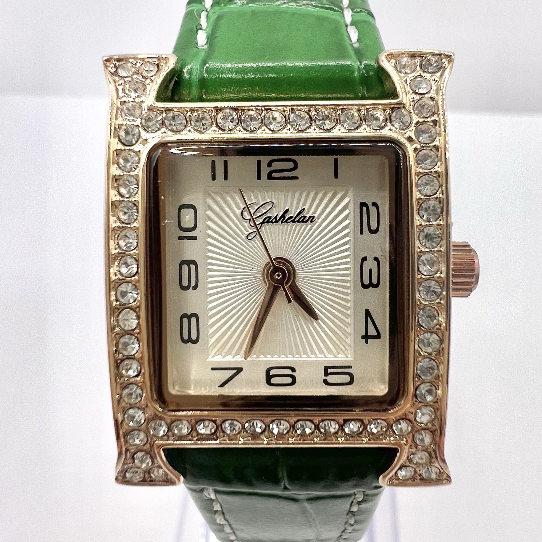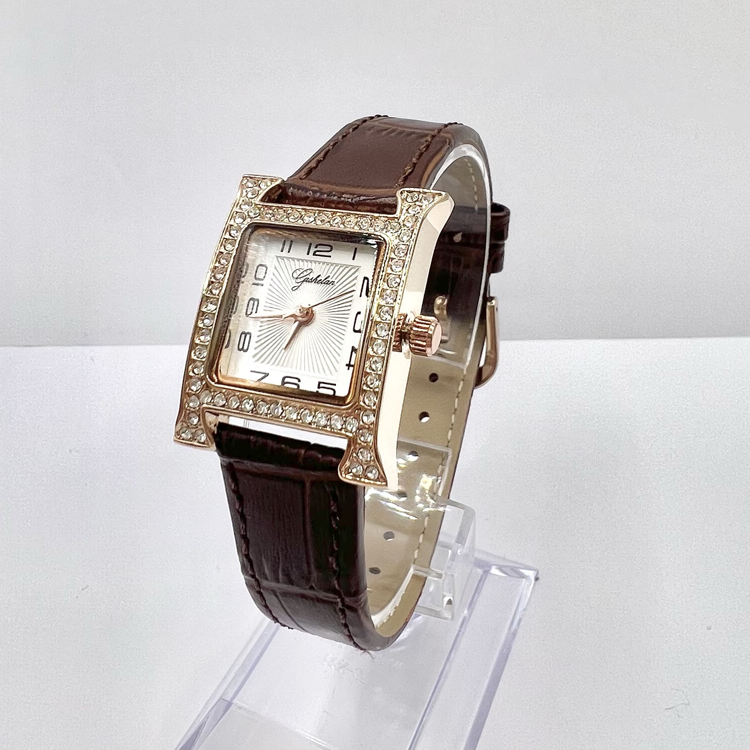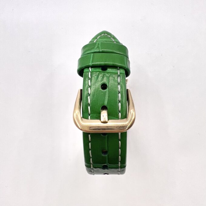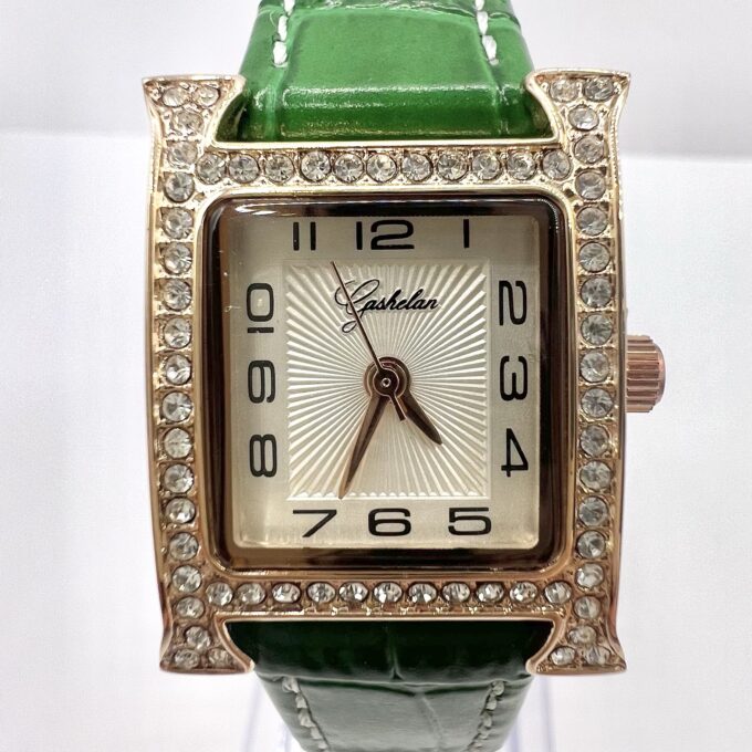 שעון משובץ אבני זרקון עם לוח לבן וכתוב באותיות יווניות עם רצועת עור