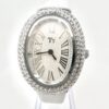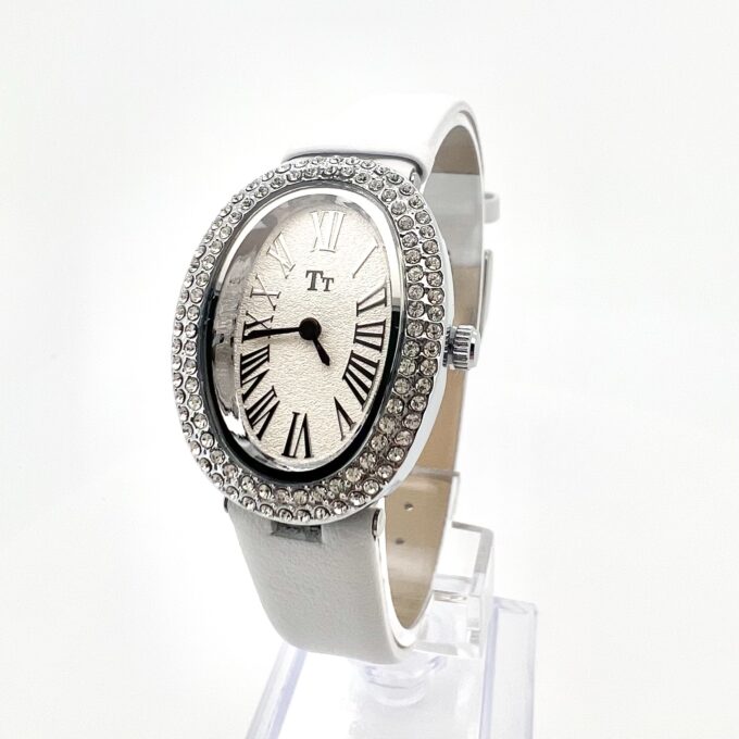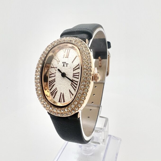 שעון אליפסה עם כיתוב במספרים יוונים משובץ אבני זרקון מסביב לשעון
