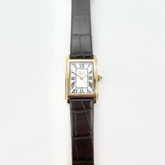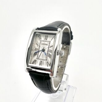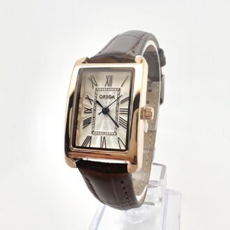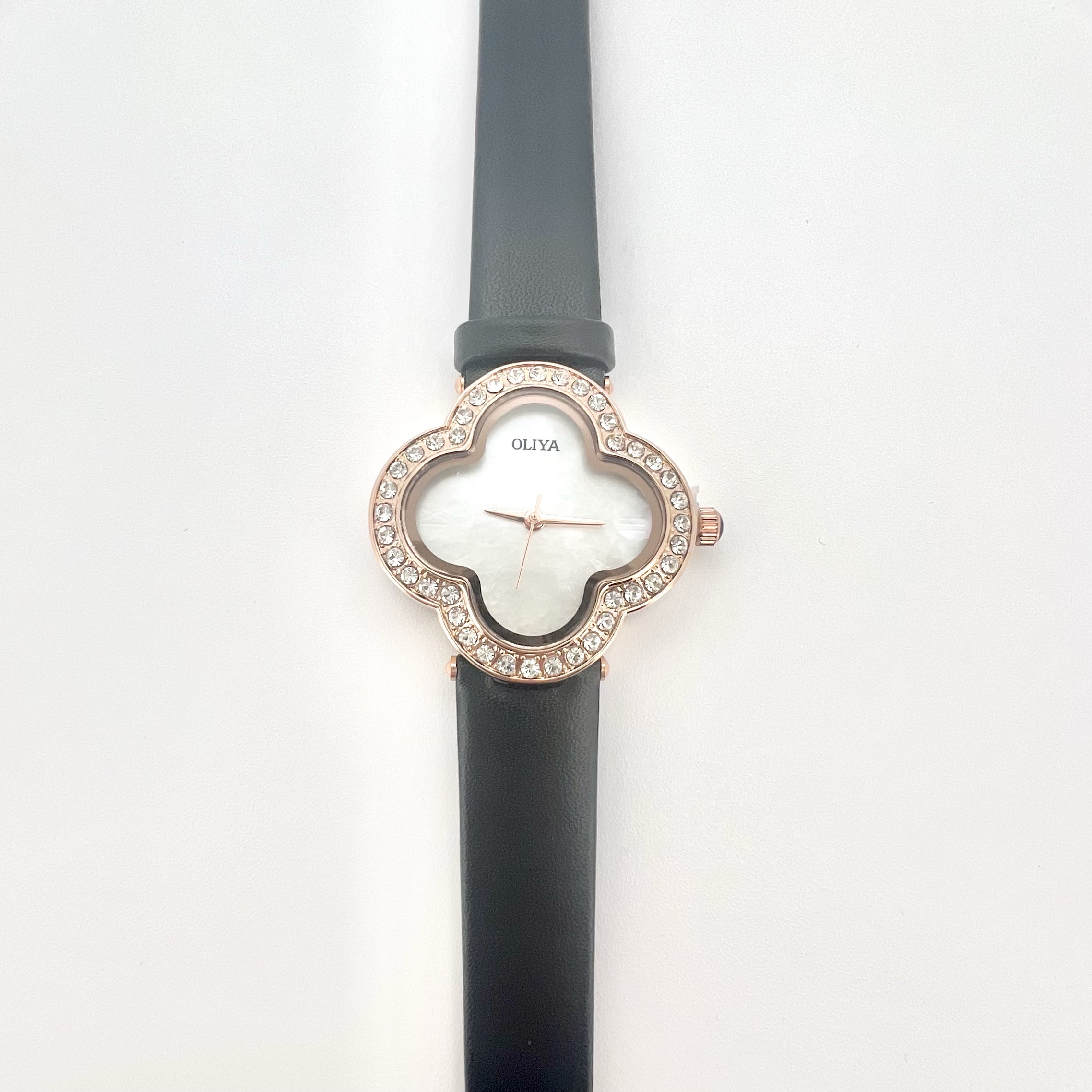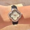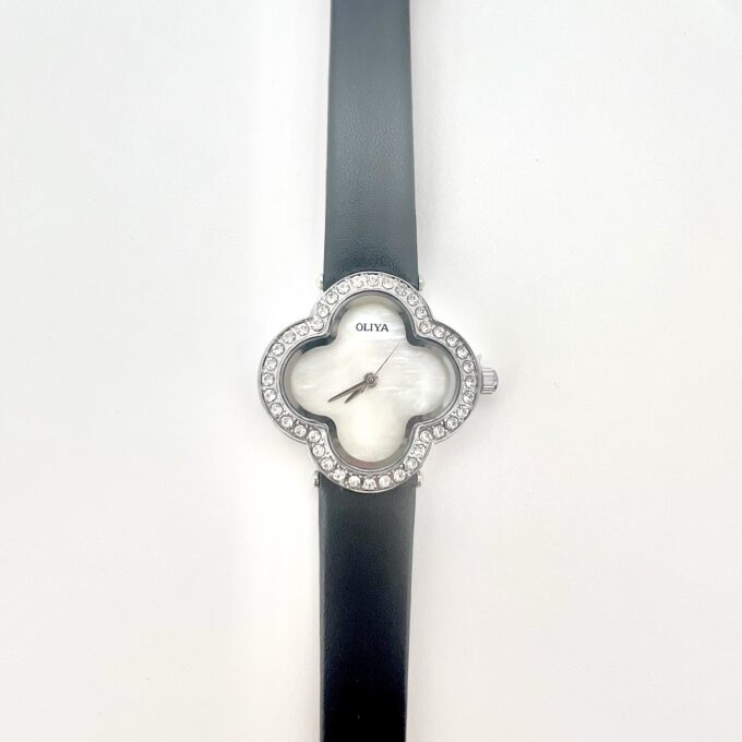 שעון בצורת פרח משובץ אבני זרקון מסביבו עם רצועת עור שניתן להגדיל ולהקטין לפי מידת היד