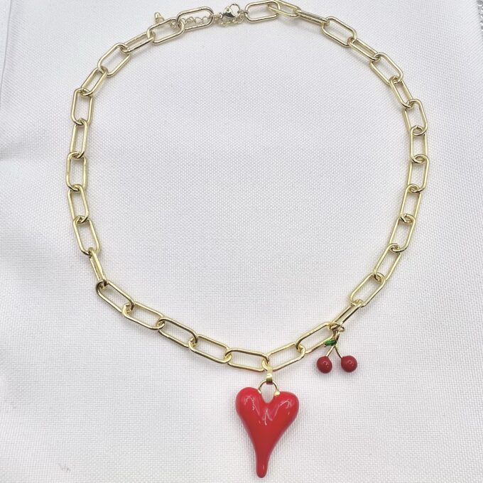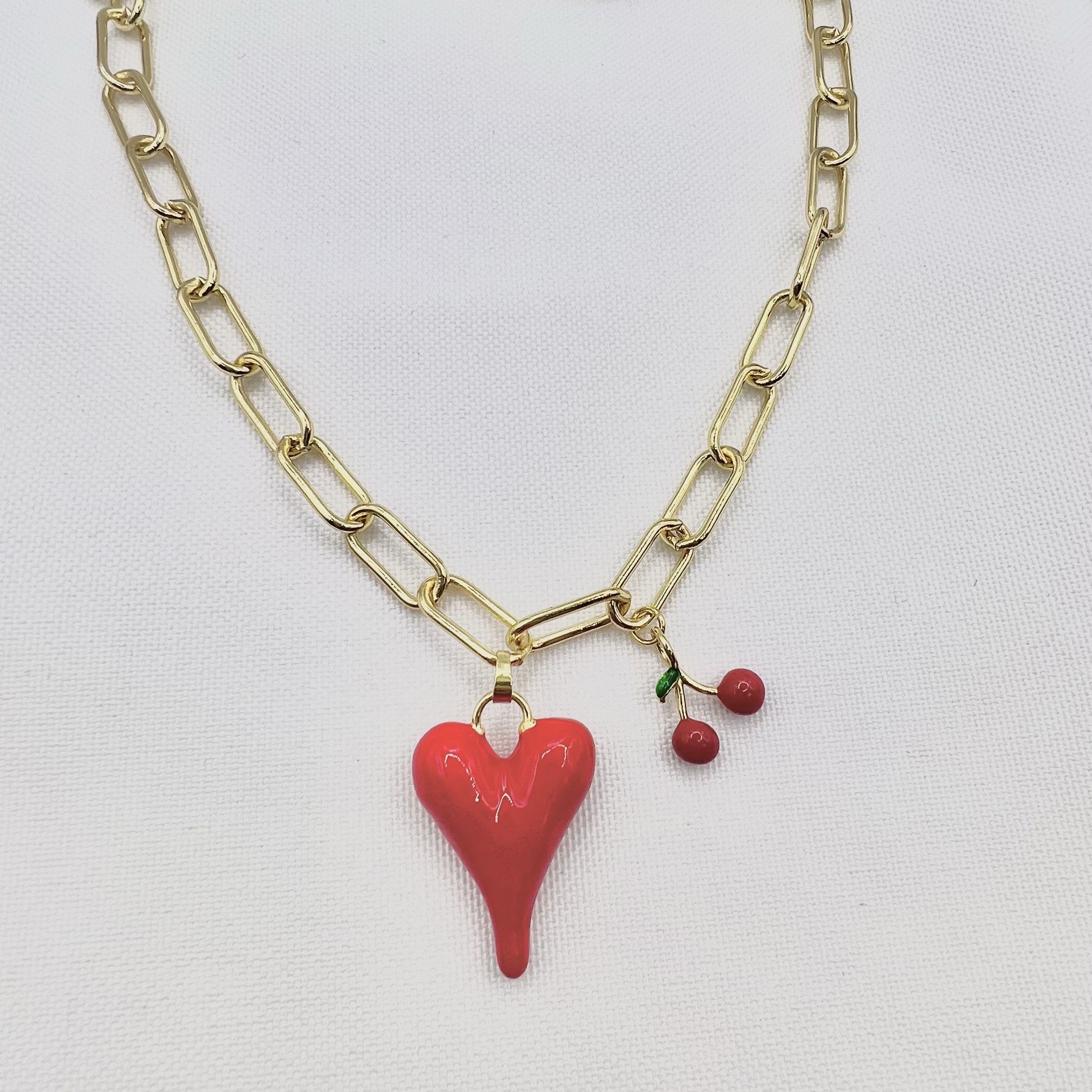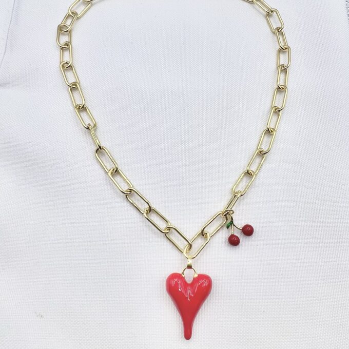שרשרת חוליות עם תליון לב מציאותי ותליון דובדבנים מחובר מרודיום איכותי